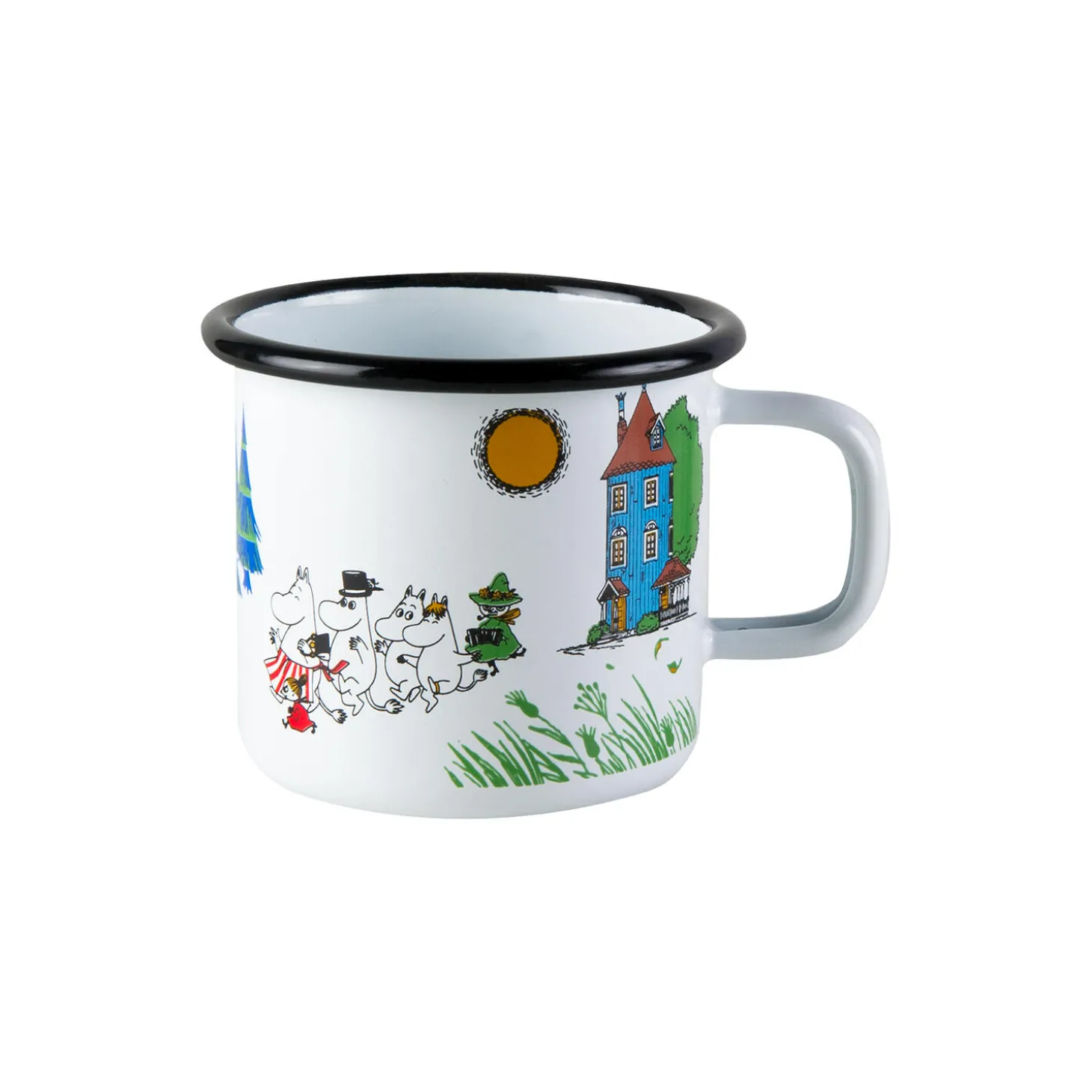 Fint emaljekrus en en god størrelse på 3,7 dl. Der gør kruset anvendeligt i mange aldersgrupper. Kruset har motiv af en god del af mumidalens beboere, mumifamilien der består af mumifar og mumimor og deres lille mumitrold samt vennerne lilly my, mumrikken og snorkfrøkenen. Alle emaljekrus udføres på fabrikker i Frankrig og hånd emaljeres i Kroatien. Muurla’s emaljekrus har en blød kant teknik, hvor krusets skarpe kant er bøjet helt indad for at skabe en behagelig overflade at drikke af. Emaljeprodukterne består af en kerne af kulstofstål, der er dobbeltbelagt med emalje af høj kvalitet. Alle Muurla’s emaljeprodukter er opvaskemaskine sikre, men må ikke anvendes i mikrobølgeovne.