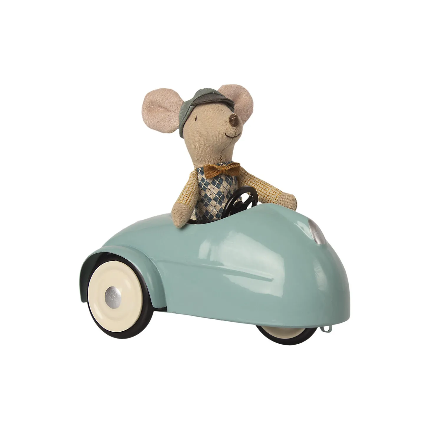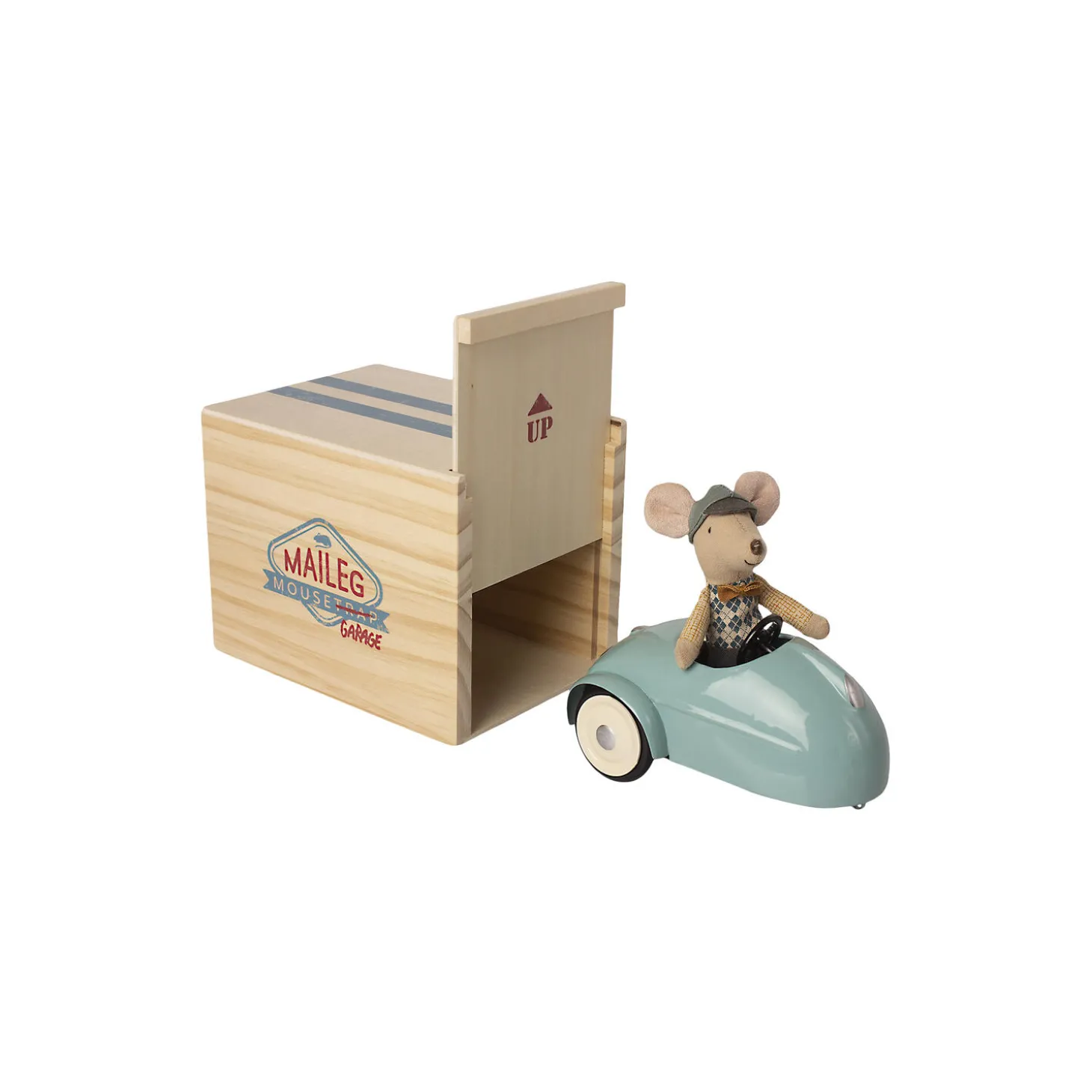 En flot vintage bil med chauffør og tilhørende garage. Metalbilen er malet i en autentisk mintblå farve og det bløde sæde har læderlook. Den flotte chauffør passer godt på bilen. God tur.