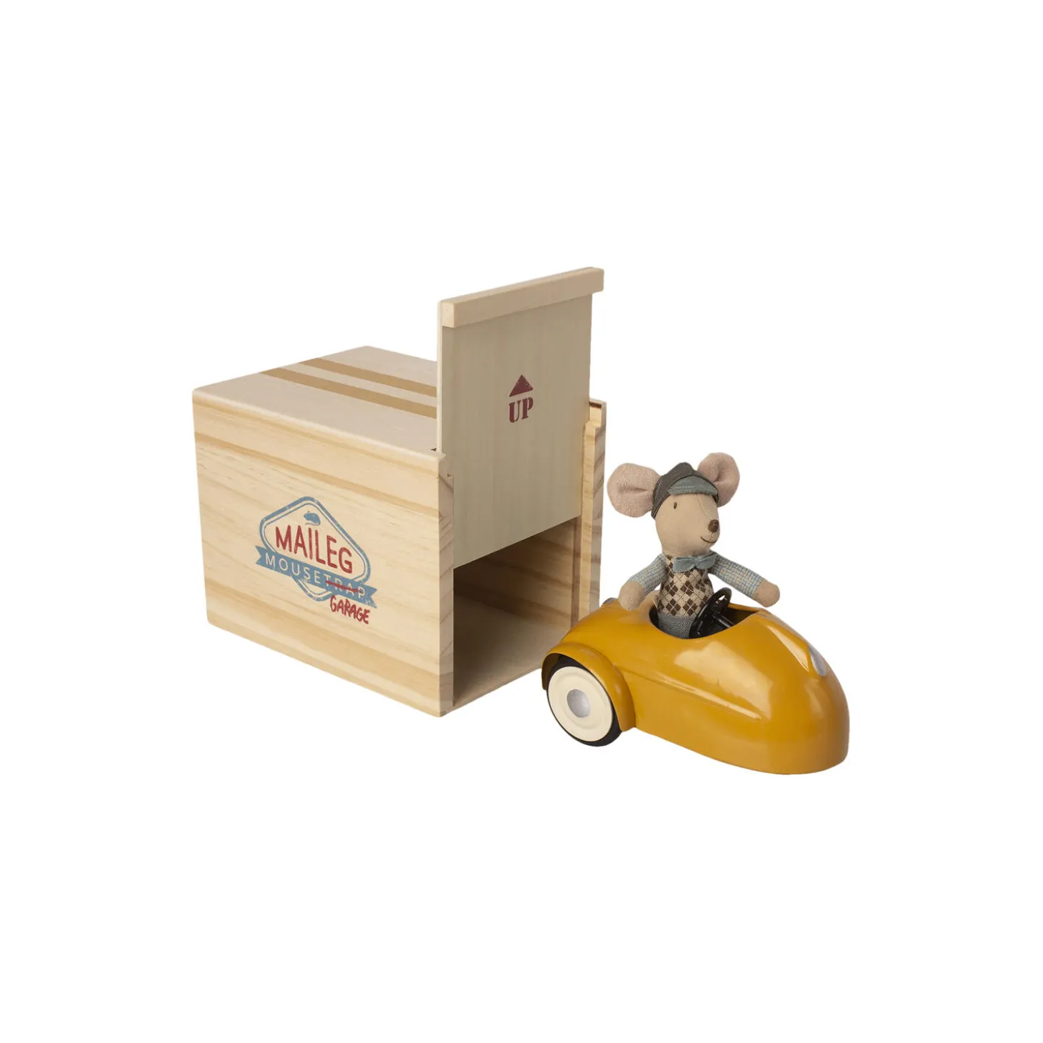En flot vintage bil med chauffør og tilhørende garage. Metalbilen er malet i en autentisk lysgul farve og det bløde sæde har læderlook. Den flotte chauffør passer godt på bilen. God tur.