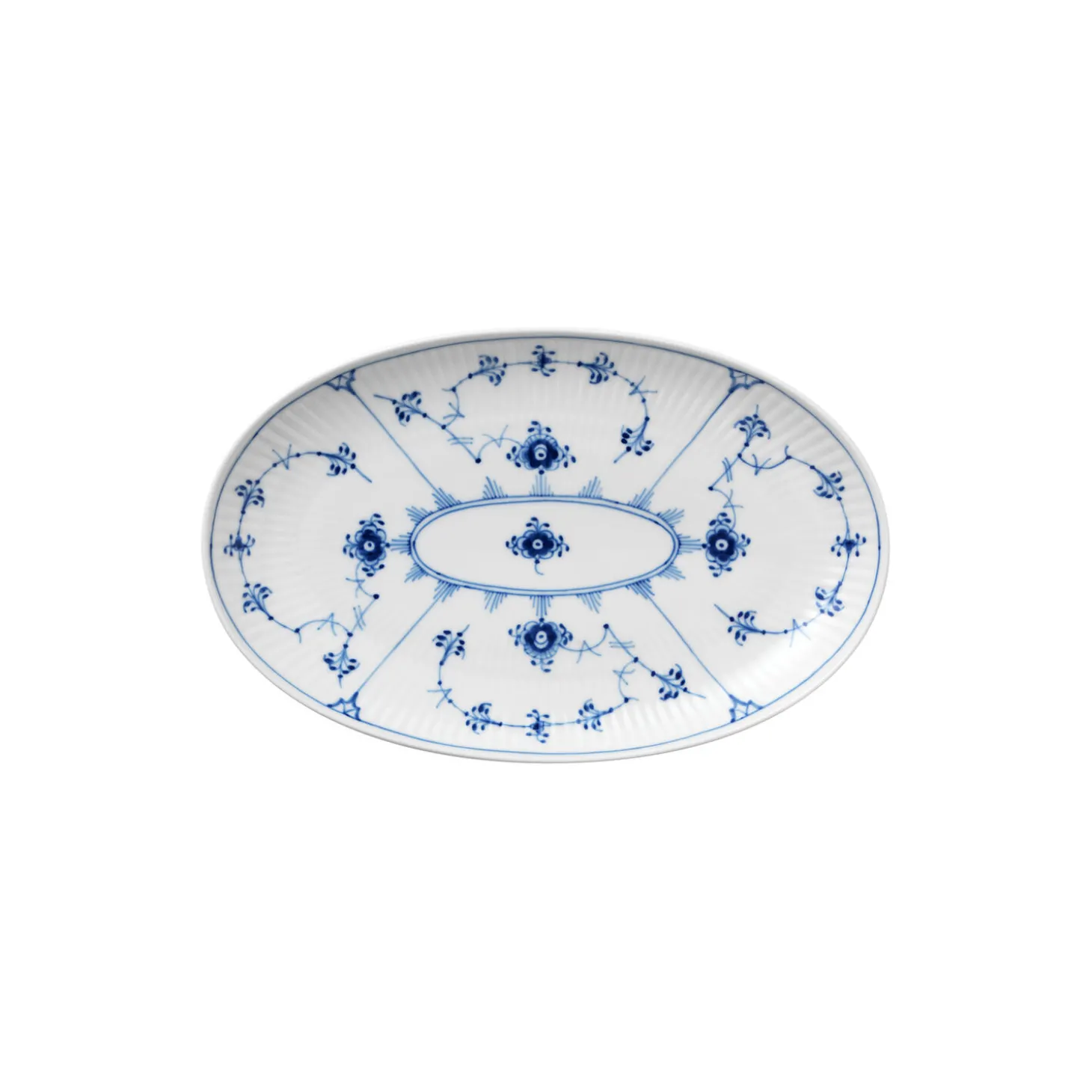 Musselmalet Riflet asiet i porcelæn fra Royal Copenhagen. Et smukt, ovalt fad som kan bruges til mindre serveringer eller som asiet til gæsternes brød eller andet på middagsbordet. Det elegante Musselmalet Riflet er håndmalet i et mønster, som sammen med fadets let buede kanter giver tallerkenen et tredimensionelt udtryk.