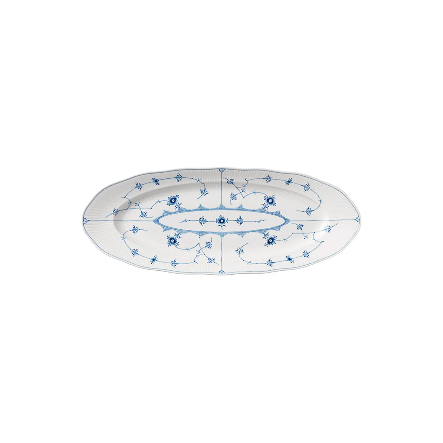 Musselmalet Riflet fad i porcelæn fra Royal Copenhagen. Dette smukke fad blev designet i 1890 og var oprindeligt et fiskefad. I dag er det op til fri fortolkning, om fadet i det smukke håndmalede mønster skal bruges som serveringsfad, et dekorativt element eller på nye oguventede måder.