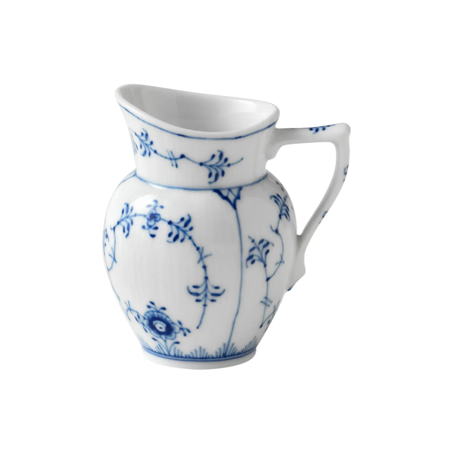 Musselmalet Riflet flødekande i porcelæn fra Royal Copenhagen. Denne charmerende, lille kande i Musselmalet Riflet har en smuk detaljerigdom, som vil gøre den til et yndet bekendtskab på dit kaffebord. Den lille hank har fået påmalet udvalgte detaljer fra mønstret, som giver et særligt fint udtryk. Brug den som mælkekande, flødekande eller prøv at server en vinaigrette i den lille kande.