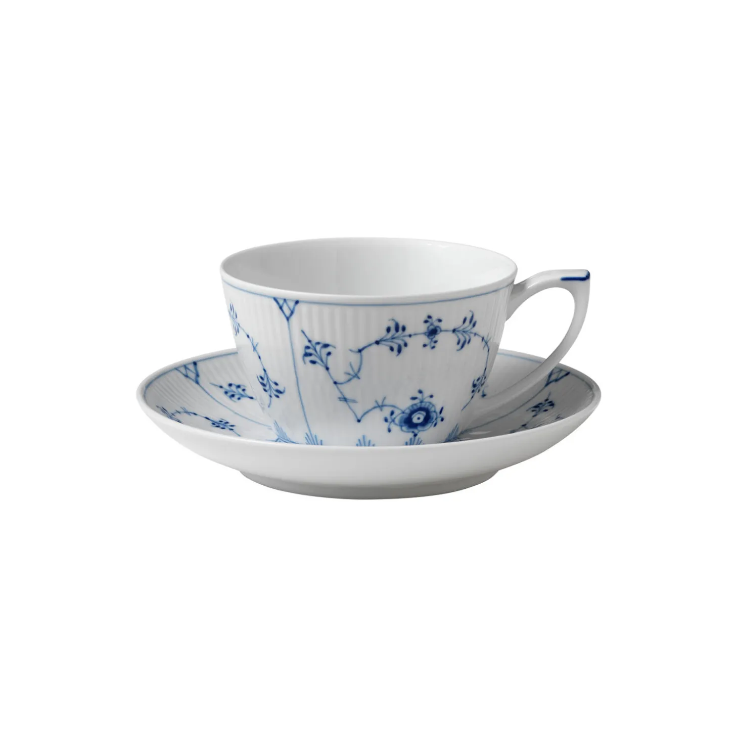 Musselmalet Riflet kop med underkop i porcelæn fra Royal Copenhagen. Den smukke tekop har en vid åbning, der lader teen køle hurtigt ned. Lad det smukke musselmalede mønster sætte scenen for et klassiske kaffebord eller skab et nyt og personligt udtryk ved at sætte tekoppen sammen med kopper og krus fra andre stel.