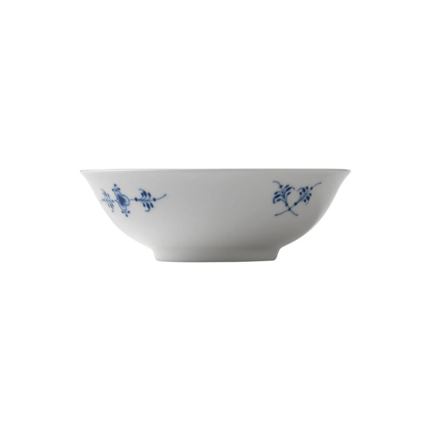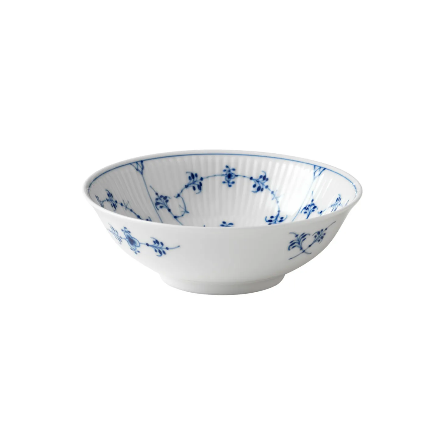 Musselmalet Riflet skål i porcelæn fra Royal Copenhagen. Den lille porcelænsskål er rigt dekoreret med det musselmalede mønster på indersiden, mens ydersiden er holdt i et simpelt udtryk med få penselstrøg. Skålens elegante design passer til enhver lejlighed.
