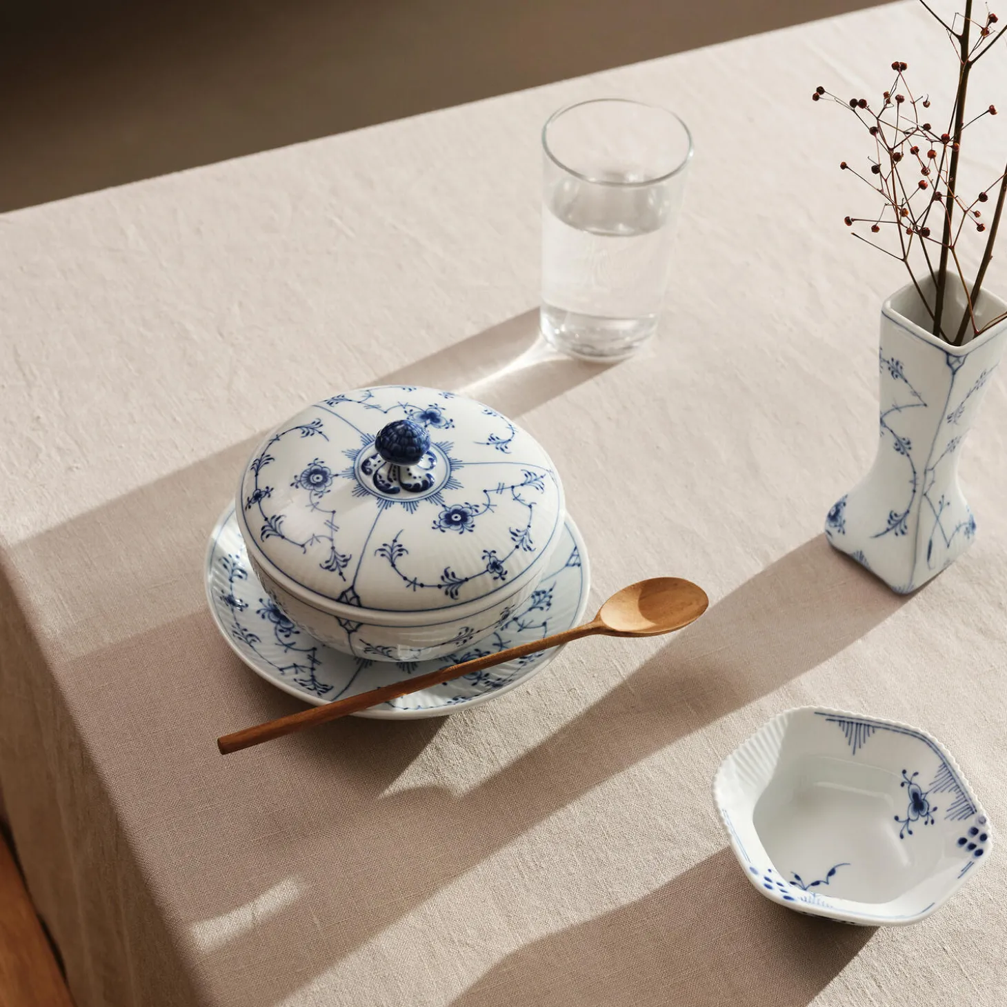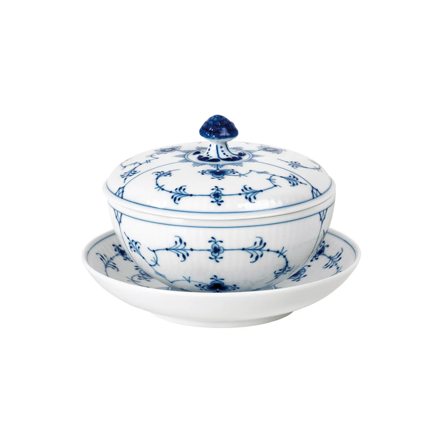 Den Musselmalet Riflet skål med låg og underkop er en smuk måde at servere suppe på eller som en lille sideskål til ris. Låget sikrer, at retten holdes varmen, og tallerken fungerer som et hvilested for din ske. En elegant tilføjelse til den Musselmalet Riflet samling.