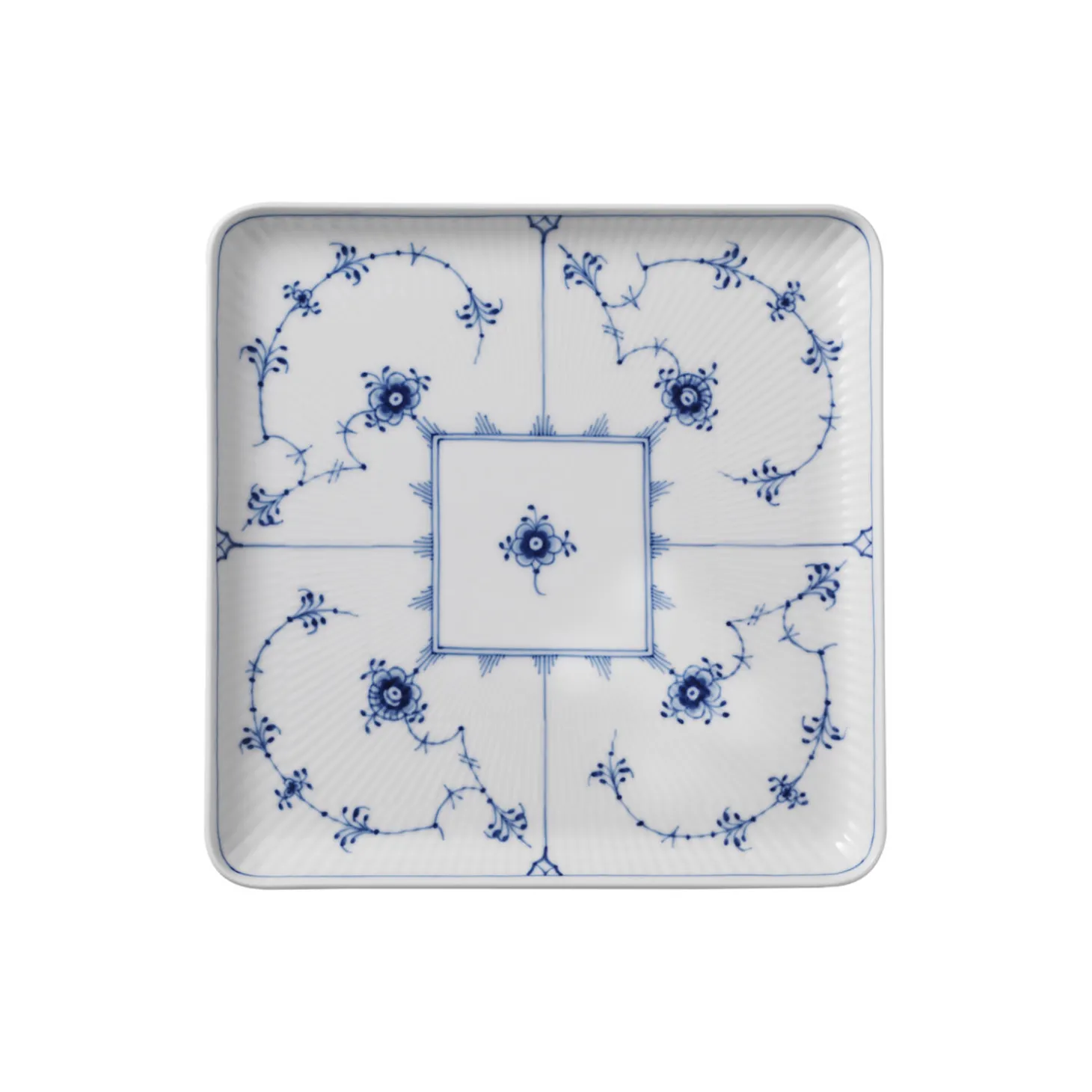 Musselmalet Riflet frokosttallerken i porcelæn fra Royal Copenhagen. Den smukke, kvadratiske tallerken er elegant hvad enten den benyttes til servering eller som spisetallerken. Det klassiske, musselmalede mønster er tilpasset tallerkenens form, hvilket skaber et skarpt og harmonisk udtryk.