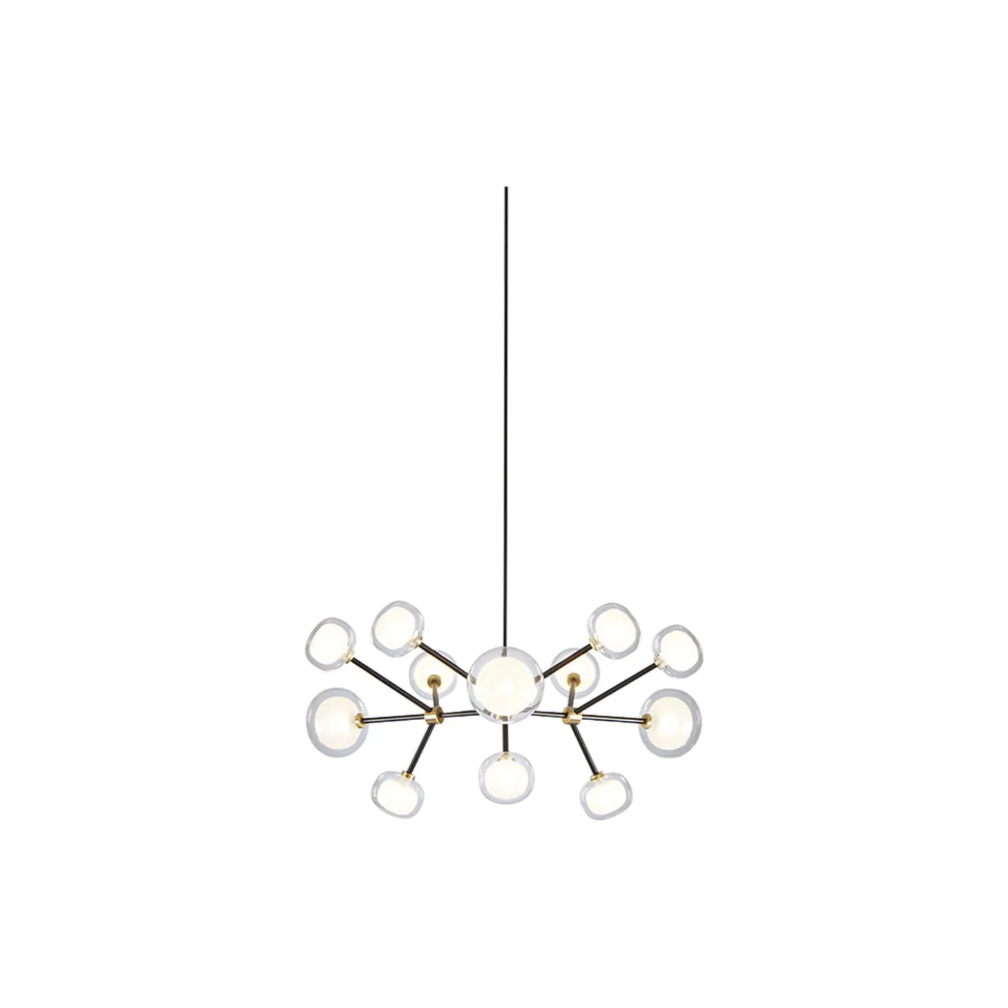 NABILA lysekrone i aluminium, børstet messing og glas fra Tooy. Farve: mat sort/børstet messing/klart glas. Mål: H: 40 x Ø 95 cm. Lyskilde: 12 x maks. 10W G9 220/240V. Design: Corrado Dotti.