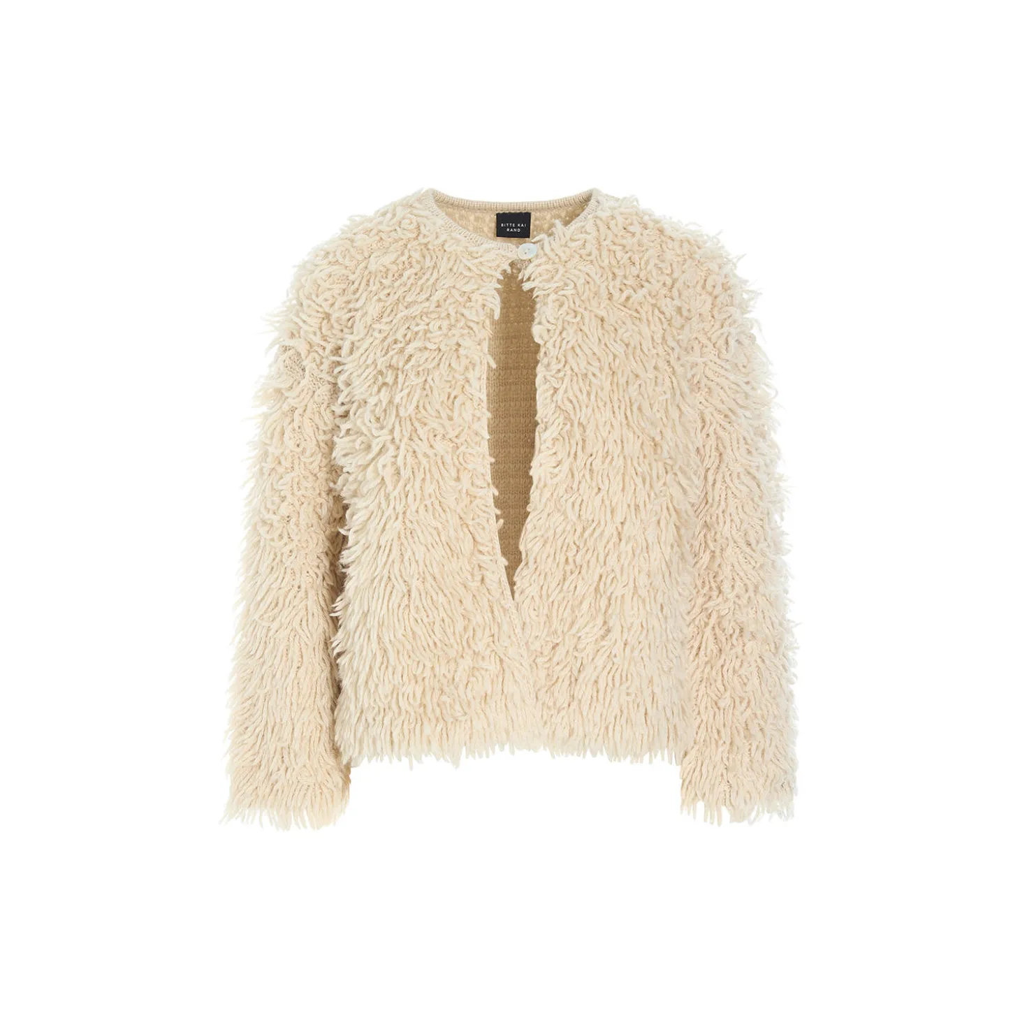 En cardigan fortolket på en ny og virkelig cool måde. Den har fluffy frynser og lukkes med en enkelt knap i halsen. Brug cardiganen til at opgradere alt fra herrebukser til kjole og nederdel. En virkelig lækker og stilsikker måde at holde sig varm på.