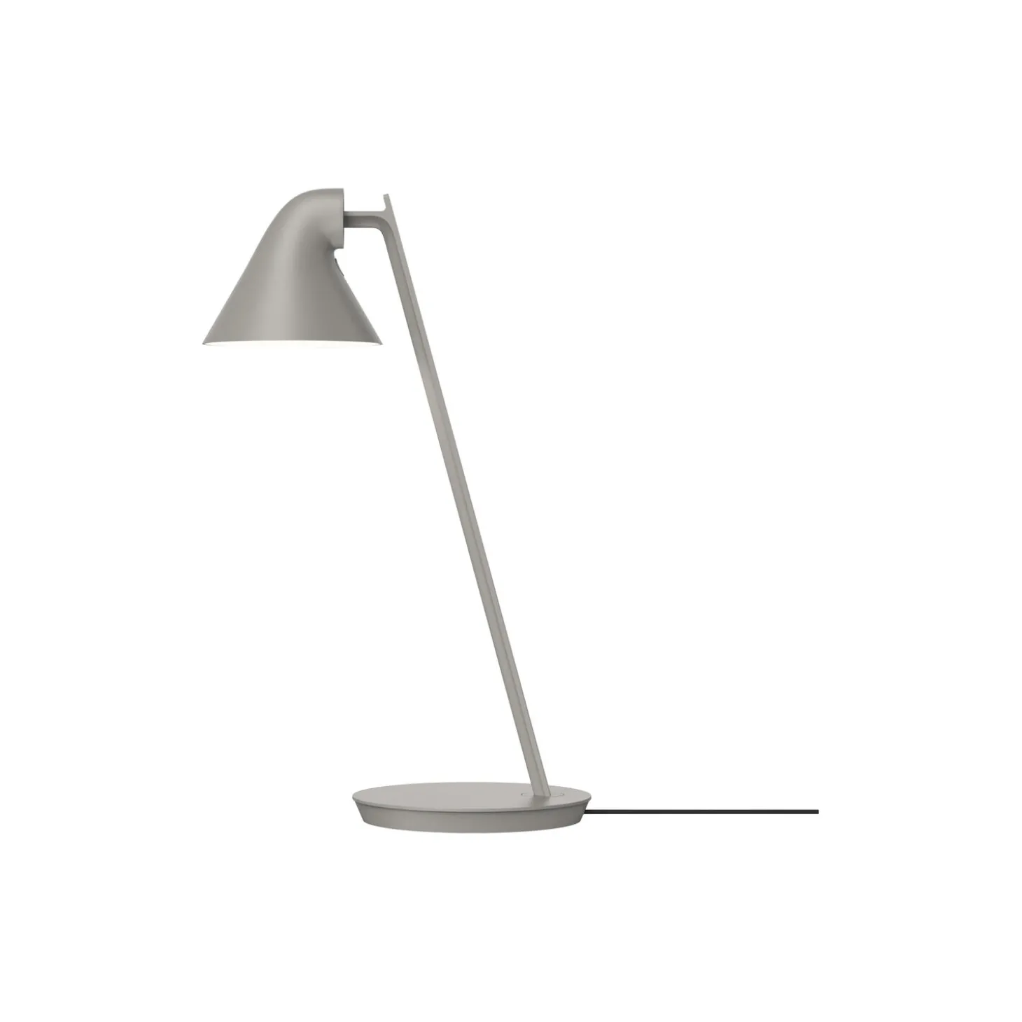 NJP Mini bordlampe med fod i stål samt arm og lampehoved i aluminium fra Louis Poulsen. Farve: lys aluminium grå. Mål:. Lyskilde: 10W LED 2700K. Design: nendo. Armaturet udsender et rundsymmetrisk, nedadrettet lys uden blænding. Når det tændes, fader det ind på et fast lysniveau, og når det slukkes, fader det ud igen. Armaturet er desuden udstyret med en timerfunktion, der automatisk slukker lyset efter fire eller otte timer. Armaturet giver en bred lysfordeling i forhold til sin relativt lille størrelse, og skærmens hvidlakerede inderside reflekterer lyset på en behagelig måde. Trinløs dæmpning gør det muligt at justere lyset til et passende niveau på mellem 15 og 100 %. Armen har en stationær vinkling på 15° og kan rotere 342° om egen fod, mens hovedet kan vippes og drejes.