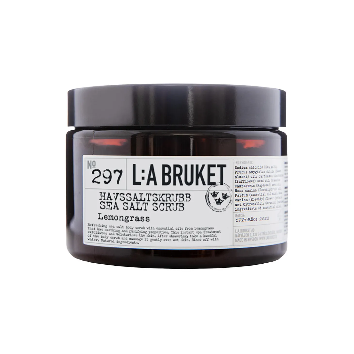 No. 063 Sea Salt Scrub fra L:a Bruket. Plejeanvisning: Opbevares på et køligt, tørt sted væk fra direkte sollys; Kun til ekstern brug. Sikkerhedsinstruktioner: Afbryd brugen, hvis der opstår irritation. Genbrugsinstruktioner: Adskil plastikbeholderen, plastikhætten og aluminiumsforseglingen før genbrug. Sørg for, at krukken og forseglingen er rene. Genbrug alle komponenter i henhold til dine lokale retningslinjer for genbrug.