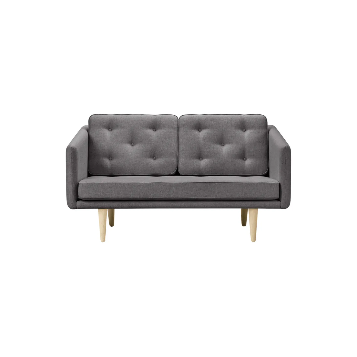 No. 1 2002 2 pers. sofa med polstring i Sunniva 3 242 tekstil af Kvadrat/Raf Simons og stel i sæbebehandlet eg fra Fredericia. Farve: grey. Mål: H: 83 x L: 143 x D: 86 cm. Siddehøjde: 42 cm. Design: Børge Mogensen.