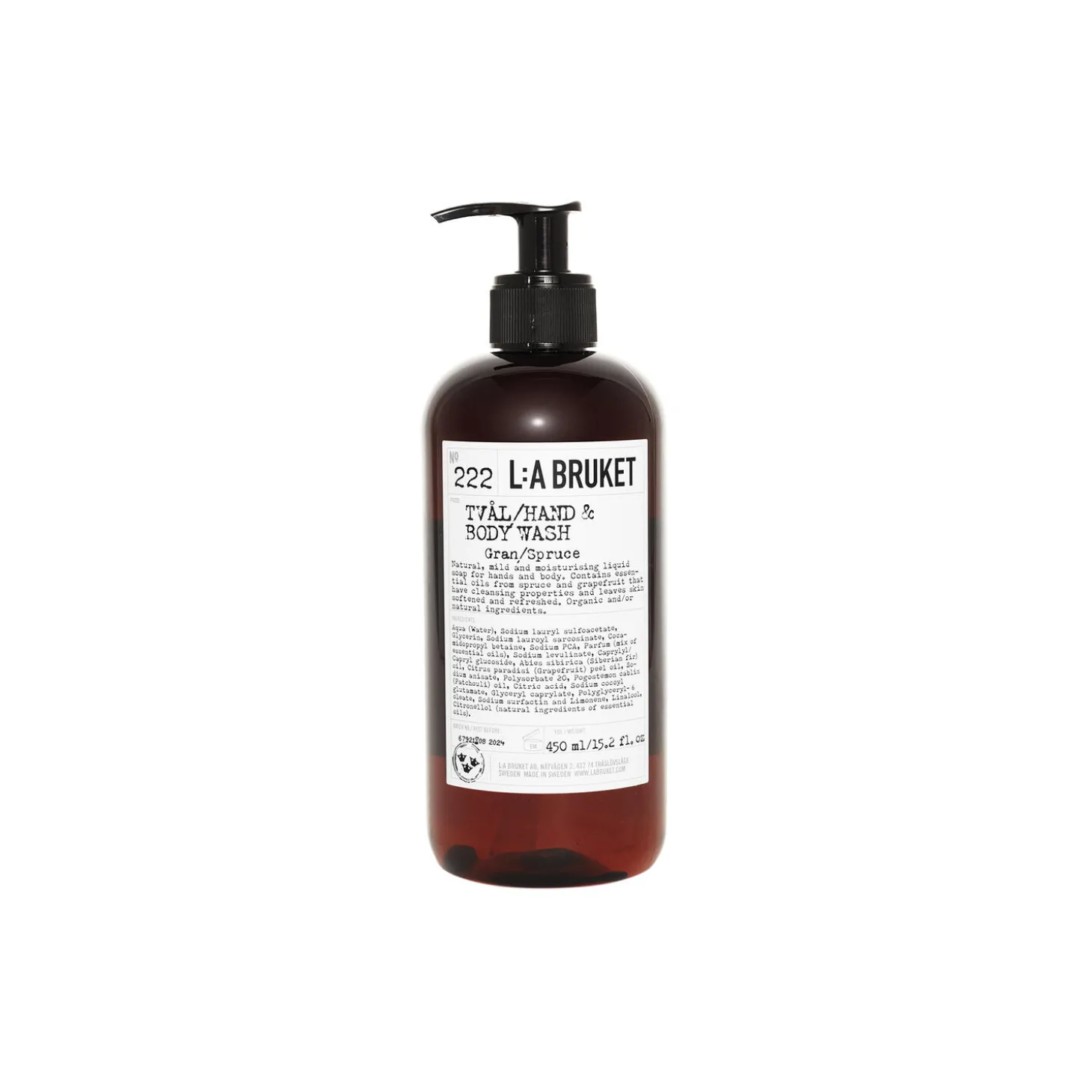 No. 222 Hand & Body Wash fra L:a Bruket. Plejeanvisning: Opbevares på et køligt, tørt sted væk fra direkte sollys; Kun til ekstern brug. Sikkerhedsinstruktioner: Afbryd brugen, hvis der opstår irritation. Genbrugsinstruktioner: Adskil pumpen fra flasken før genbrug. Bortskaf pumpen i almindeligt affald. Sørg for, at flasken er tom før genbrug. Genbrug plastikflasken i henhold til dine lokale retningslinjer for genbrug.