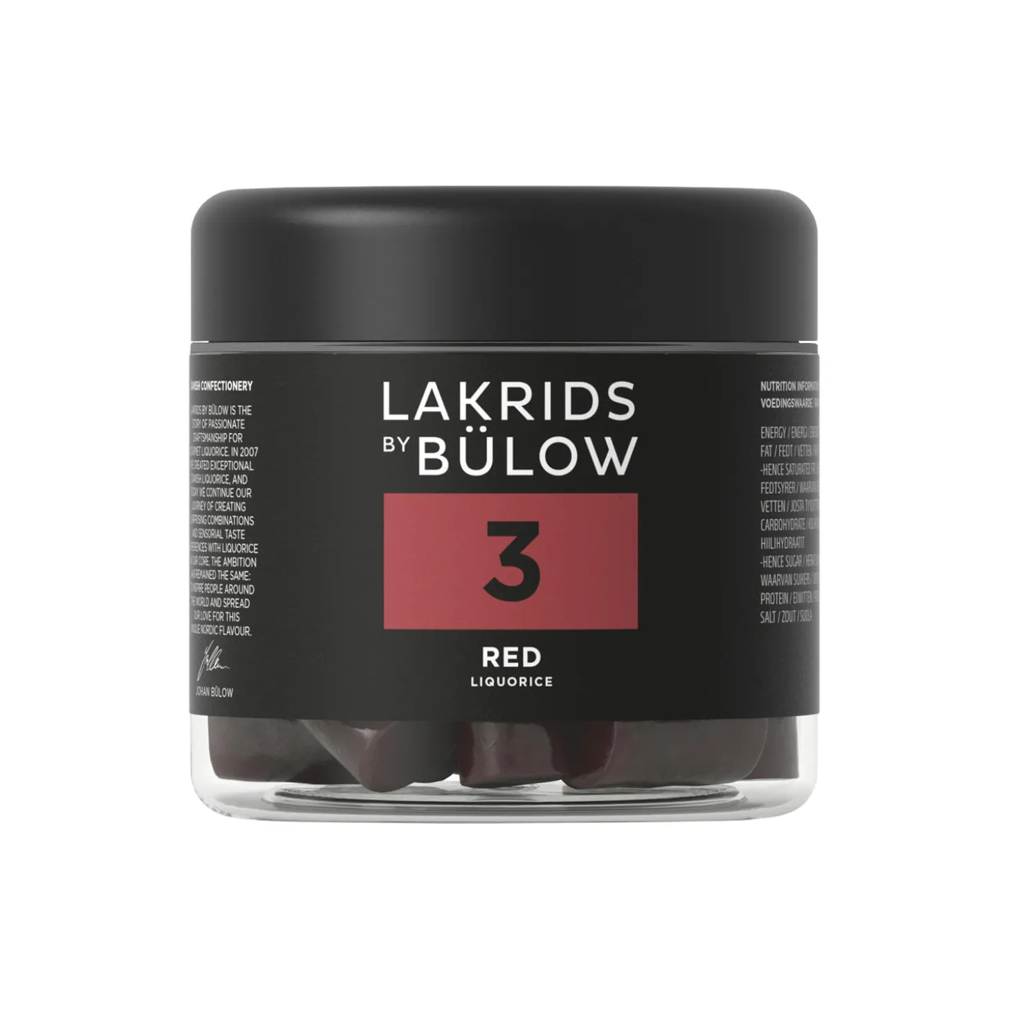 Det har taget os mere end 5 år at skabe Johan Bülows variation af amerikansk lakrids – nemlig rød lakrids. Blød, men med bid i og fyldt med koncentreret frugtsaft af solbær, tranebær og jordbær afstemt med lakrids.