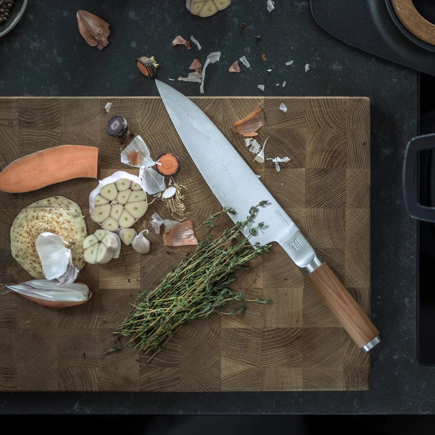 Fiskars Norden-knivene er lavet af premium materialer. Den store Norden kokkekniv er en robust all-around kniv til alle skæreopgaver. Knivbladet er lavet af tysk karbonstål af højeste kvalitet, hvilket sikrer en overlegen funktionalitet og langvarig skarphed. Derudover er knivbladet slebet med den optimale 26˚ vinkel, som yderligere understøtter knivbladets fortræffelige skarphed. Håndtaget er fremstillet af varmebehandlet birketræ, hvilket gør kniven meget behagelig i hånden og naturligt smuk. Knivbladet har en hårdhed på HRC 56. Vi anbefaler at vaske dine knive i hånden. Det varmebehandlede håndtag I bøgetræ på Fiskars Norden knivene giver et æstetisk Nordisk udtryk. De naturlige variationer i farve og tone tilfører knivene autensitet og stil. Produceret i Finland. Unikt, fra naturens side.