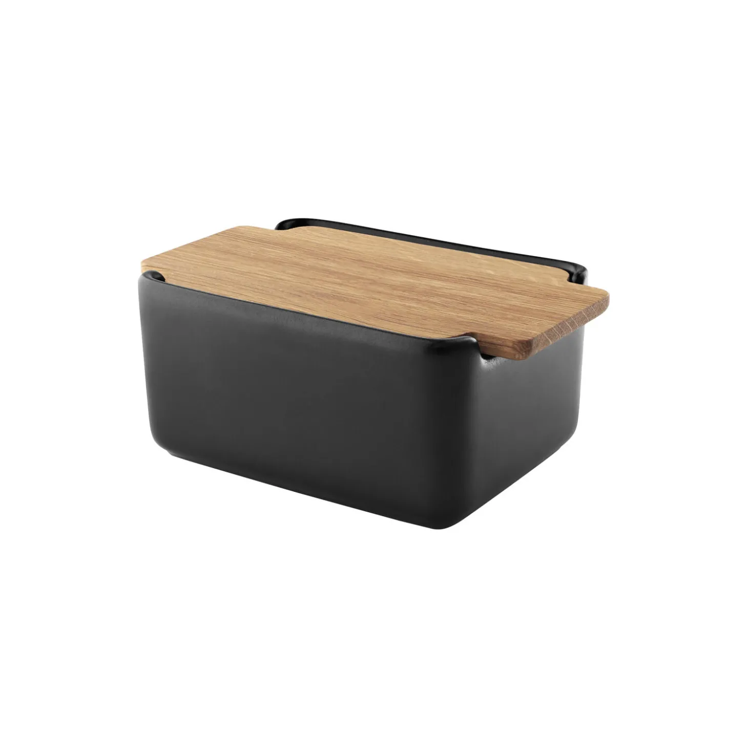 Slut med fedtet smørpapir i køleskabet. Enkelt smørskål i sort stentøj med låg i olieret eg giver hygiejnisk opbevaring af smør. Skålen passer til størrelsen på en standard smørpakke. Sæt også skålen direkte på bordet – og brug den f.eks. til snacks eller slik. Skålen tåler maskinopvask, låget skal dog vaskes i hånden. Egetræet vedligeholdes med jævnlig oliering.