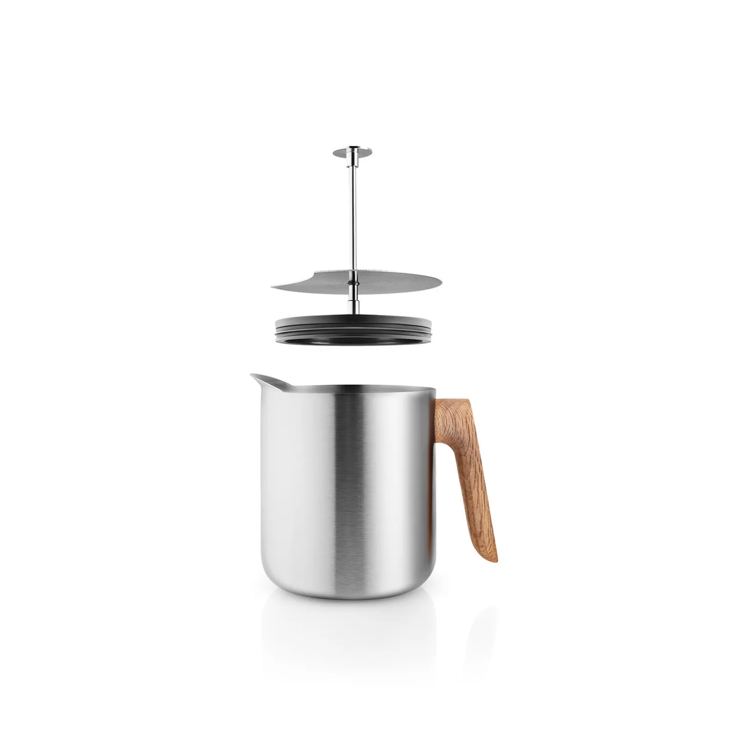 Nordic kitchen stempeltekande med unikt ventilsystem brygger teen præcis som du vil have den. Samtidig holder den teen varm i lang tid på grund af sin dobbeltvæggede termoeffekt. Stempeltekanden anvender det samme bryggesystem som en stempelkande og giver dermed fuld kontrol over teens trækkeproces. Tryk blot stemplet ned, når den ønskede trækketid er nået. Stemplet fanger tebladene i bunden af filtret og skiller vandet fra tebladene, så teen ikke trækker videre. Det gør det nemt at regulere styrken, som du foretrækker den. Velegnet til te i løs vægt. Stemplet tåler maskinopvask, men kanden skal vaskes i hånden. Vedligehold træhåndtaget med jævnlig oliering. Fremstillet i børstet rustfrit stål, håndtag i olieret egetræ og med silikonepakning.