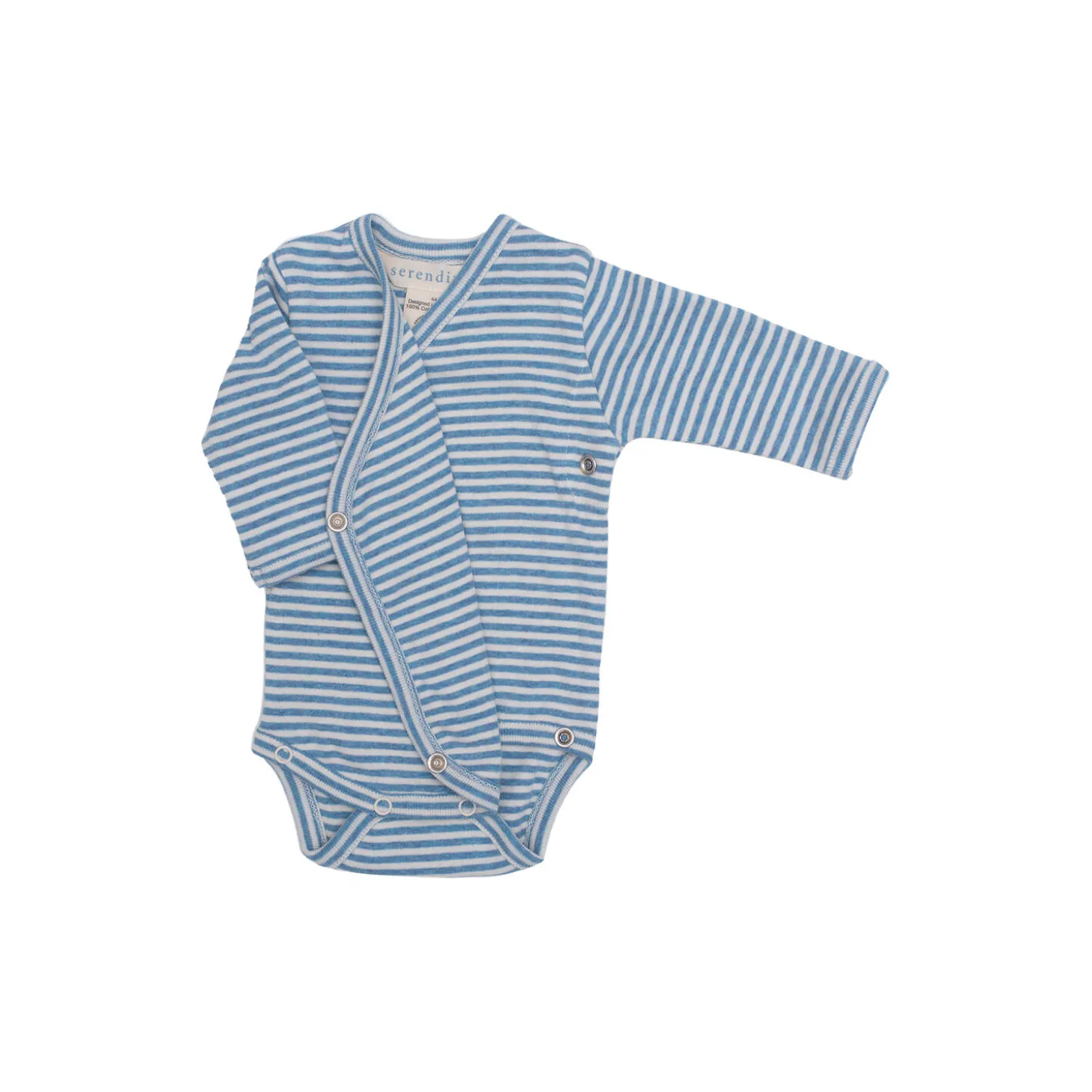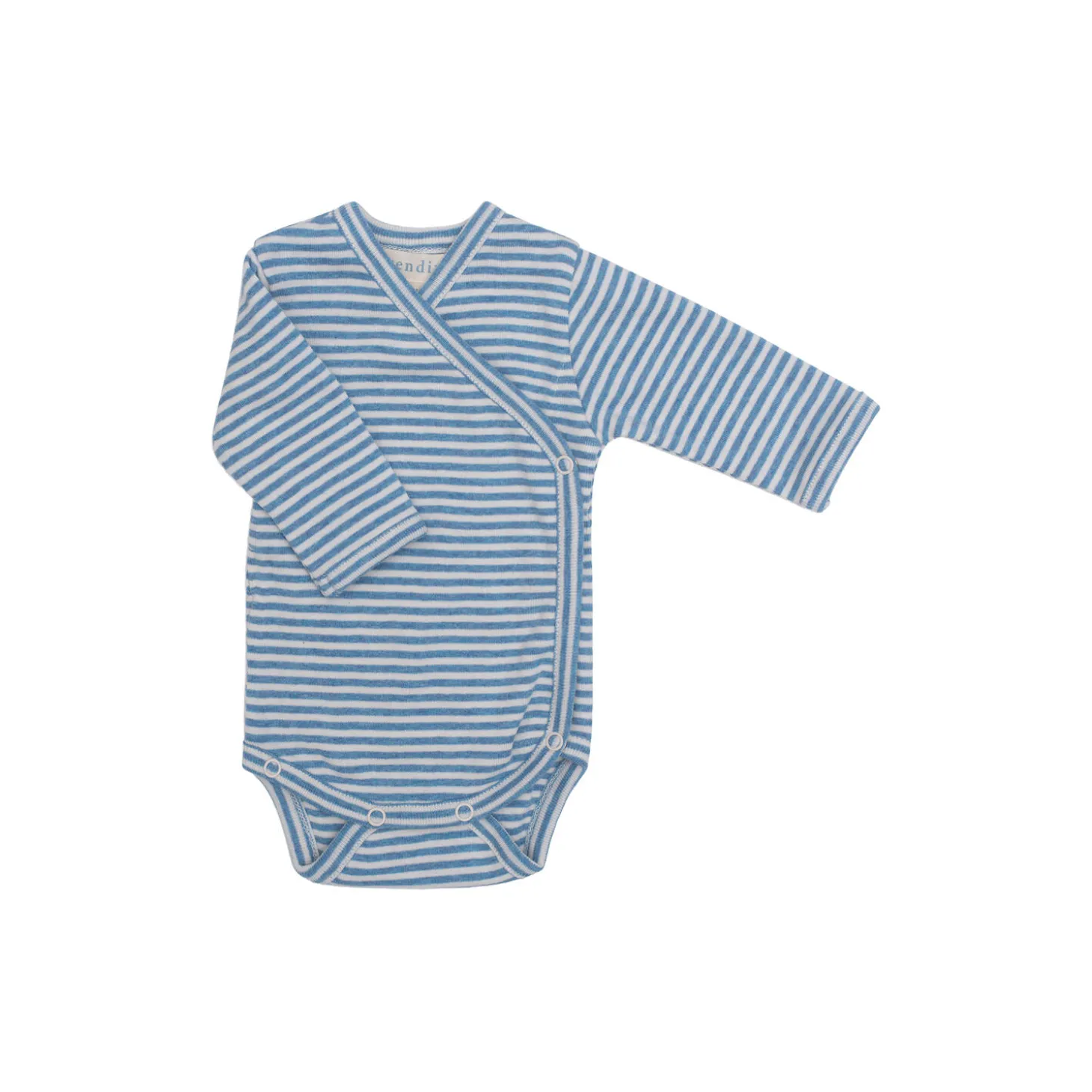 Stribet slå-om body med trykknapper til baby første tid. Smalle striber i Azurblå og offwhite melange. Str. 38 og 44 har et lille hul i siden til eventuelle slanger. Syet af blød økologisk bomulds rib og GOTS certificeret produceret.
