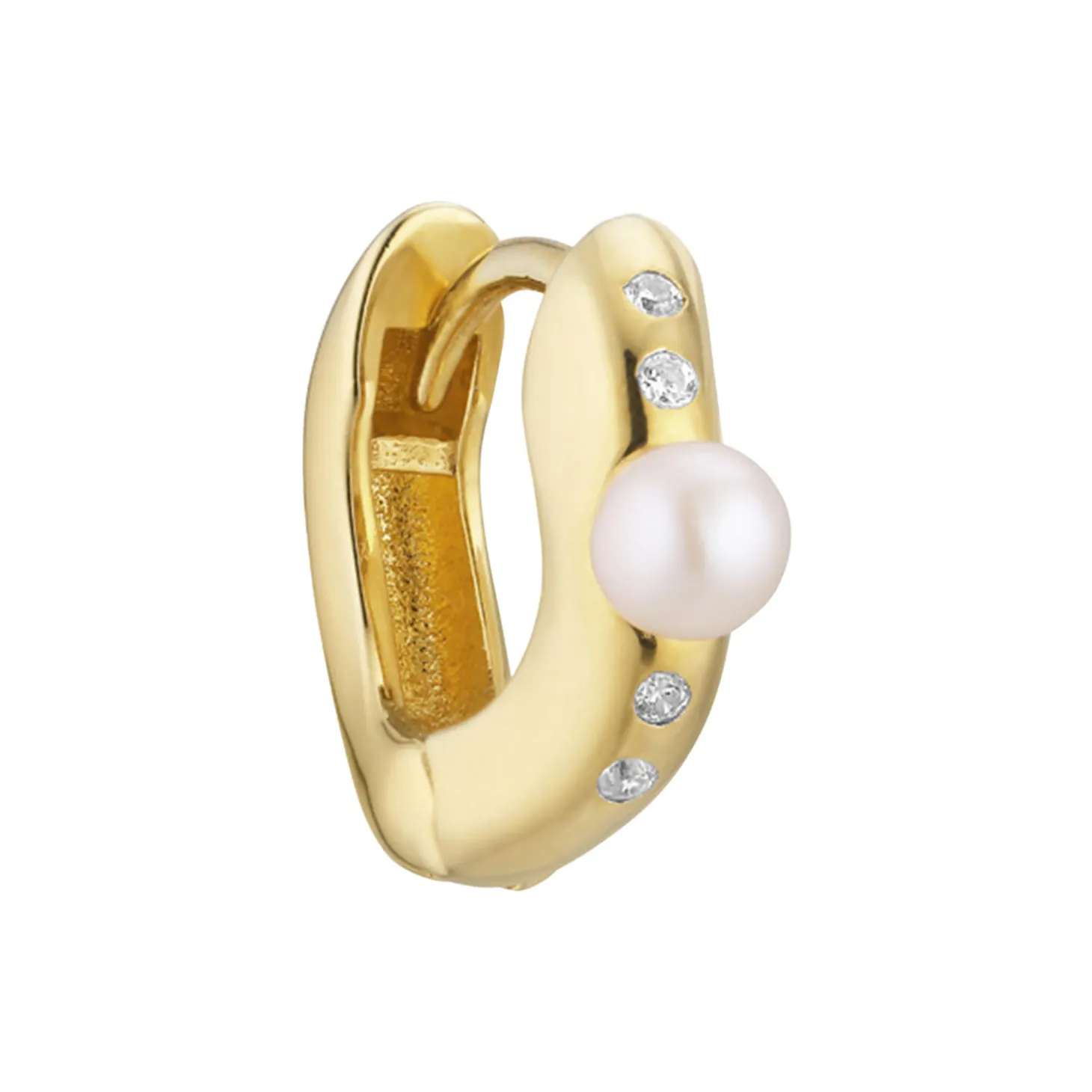 Lille bølgende huggie ørering med en hvid ferskvandsperle og klare sten. Sælges enkeltvis.