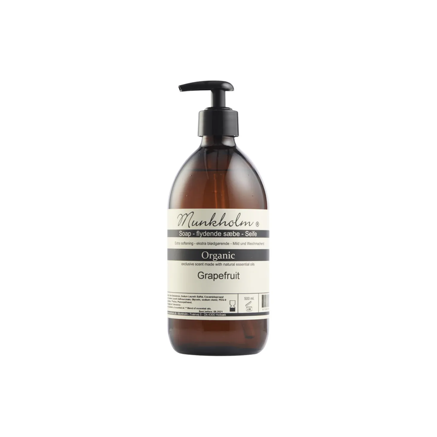 Økologisk flydende sæbe med aloe vera fra Munkholm. Duft: grapefrugt og pomelo. Indeholder: 500 ml.