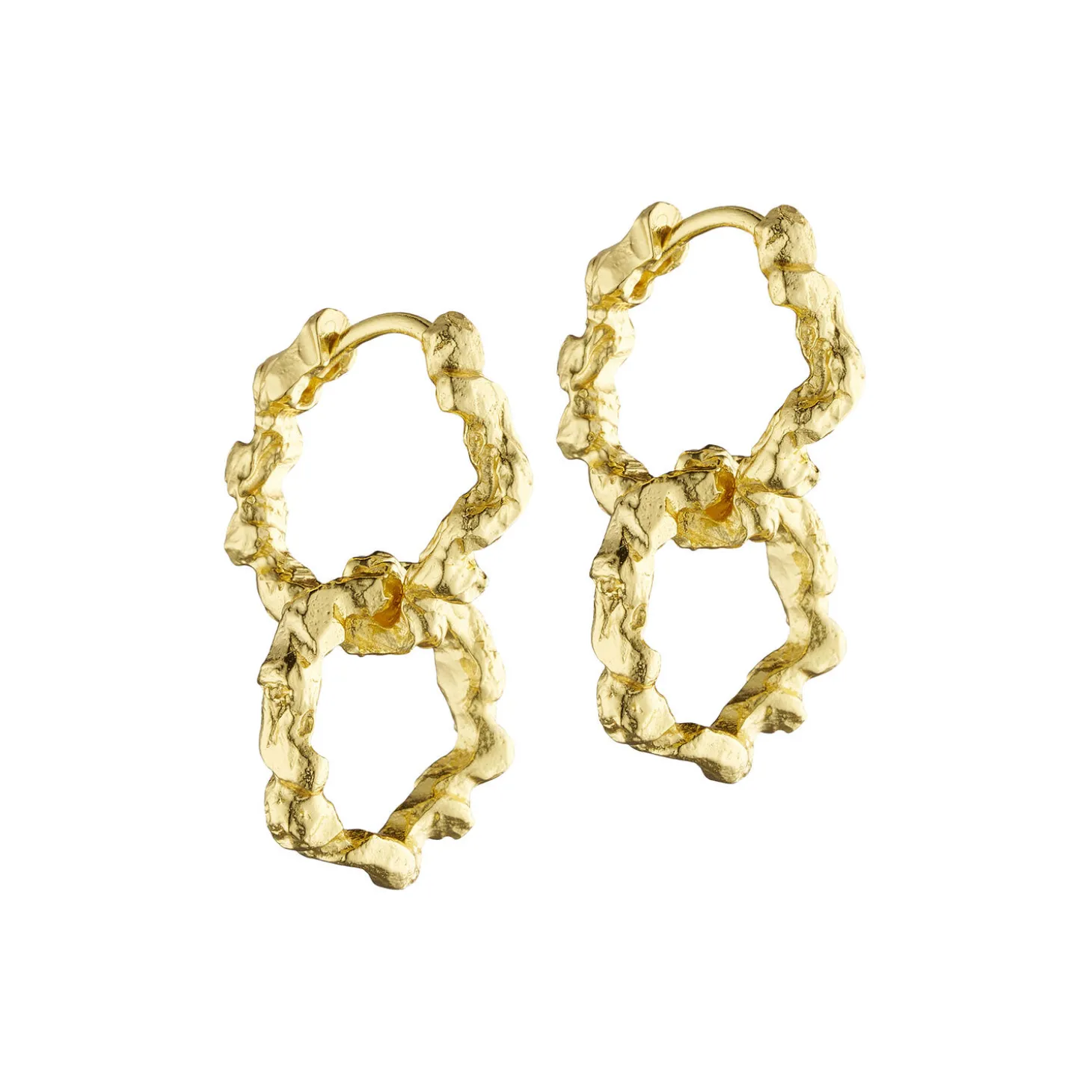 Disse dobbelt øreringe er med sit foil finish og teksturrige design et cool og alsidigt smykke. Øreringen kan nemlig også fungere som en enkel creol, takket være åbningens design. Du kan bære disse øreringe alene for at få et minimalisktisk look eller sætte dem sammen med dine andre øreringe og få et stacked og cool look.