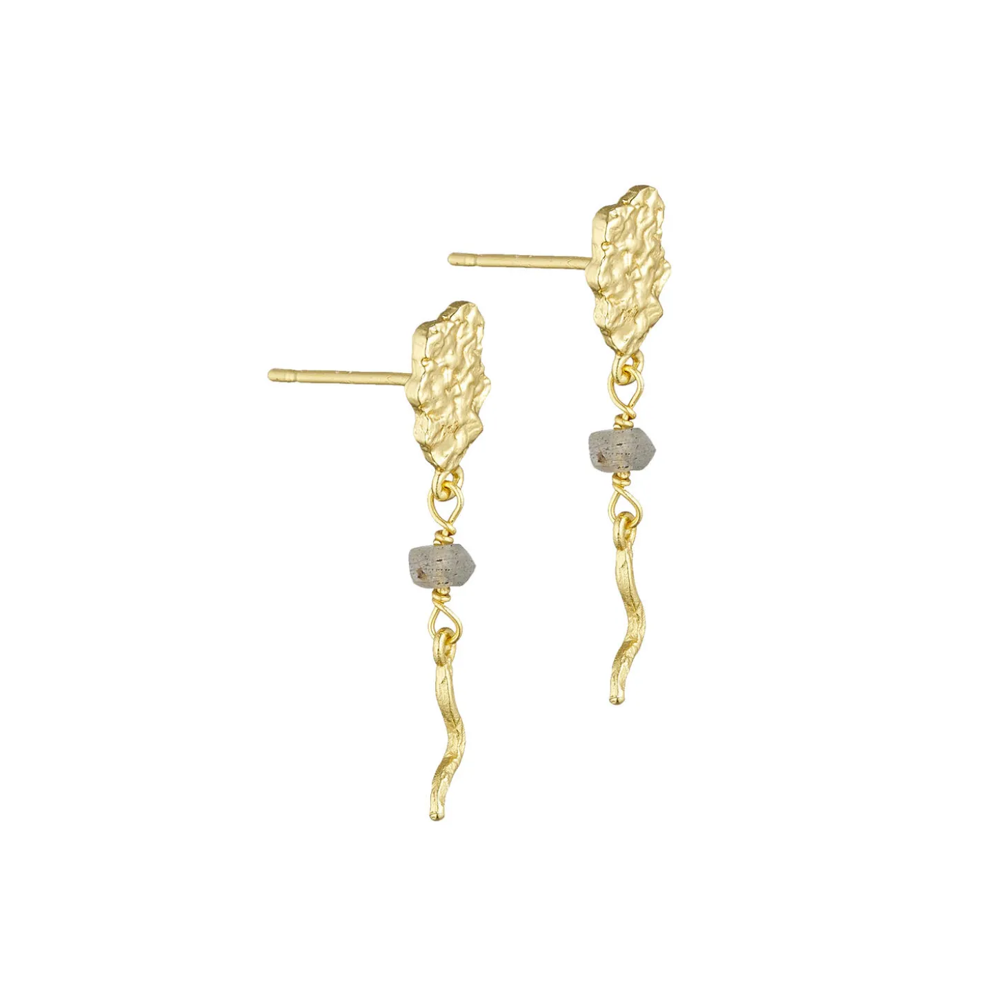 Disse unikke øreringe er beklædt med et råt foil finish, smukke natursten og ægte ferskvandsperler. Ferskvandsperlerne og naturstenene labradorit, malachit og tourmalin giver dig valget mellem forskellige farver og udtryk, som du nemt kan mixe og matche med dine favorit smykker. Alle perler og natursten bærer præg af naturens variationer, hvilket gør hver ørering helt unik. Øreringene er håndlavede, 24K guldbelagt og sølvbelagt og passer til enhver og alle lejligheder.