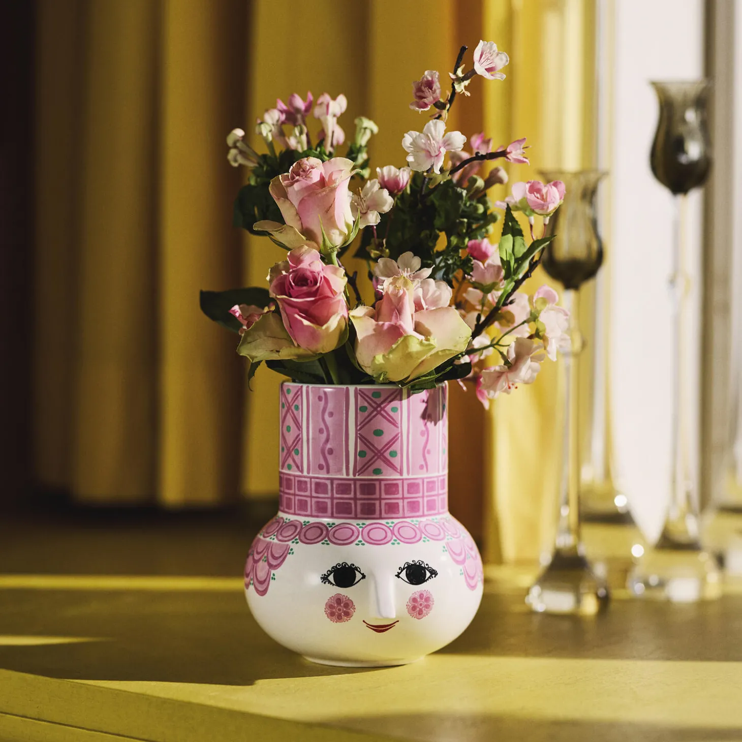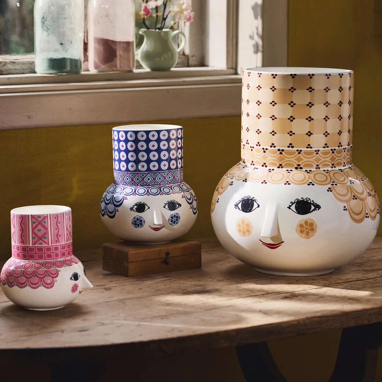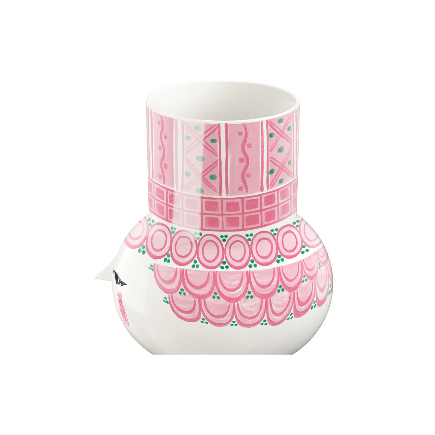 Udfold din farverige personlighed og lad kreativiteten blomstre med Bjørn Wiinblads Olga. Med sit glade smil, de blussende kinder og farverige dekorationer rummer Olga på alle måder essensen af Bjørn Wiinblad som person og kunstner – også når hun tager form som vase. Glad og drømmende skaber hun liv og personlighed i indretningen med sit poetiske udtryk og sine sprudlende farver. Olga-vasen er en nyfortolkning af en ikonisk vase, som Bjørn Wiinblad lavede i samarbejde med den keramiske fabrik Nymølle. Den har den samme cylindriske top som vasen fra Bjørn Wiinblads imponerende designarkiv og prydes af et sødt rundt ansigt med de mandelformede øjne og den ikoniske trekantede næse, der nok nærmest er selve personificeringen af Bjørn Wiinblads kunst. Den mindste vase i serien måler 15 cm i højden, men her er der så til gengæld med en klar pink med små grønne prikker fråset lidt mere med farverne. Alle Olga-vaser er lavet af skinnende glaseret keramik med farverige decals, og dekorationerne er en skøn blanding af originale Bjørn Wiinblad-mønstre, der i en skøn varieret farvepalet giver dig et moderne og friskt udtryk. Bjørn Wiinblad var en livsglad kunstner med en stor og farverig personlighed, der gik sine egne veje og ikke var bange for at drømme og tænke stort. Den sjæl mærkes også til fulde i Olga, der hviler i sig selv og inviterer os til at udtrykke vores egen stil og personlighed i indretningen med farverige blomsterbuketter, eksotiske planter og kreative dekorationer. En ting er sikkert: Det bliver ikke kedeligt, når Olga flytter ind.