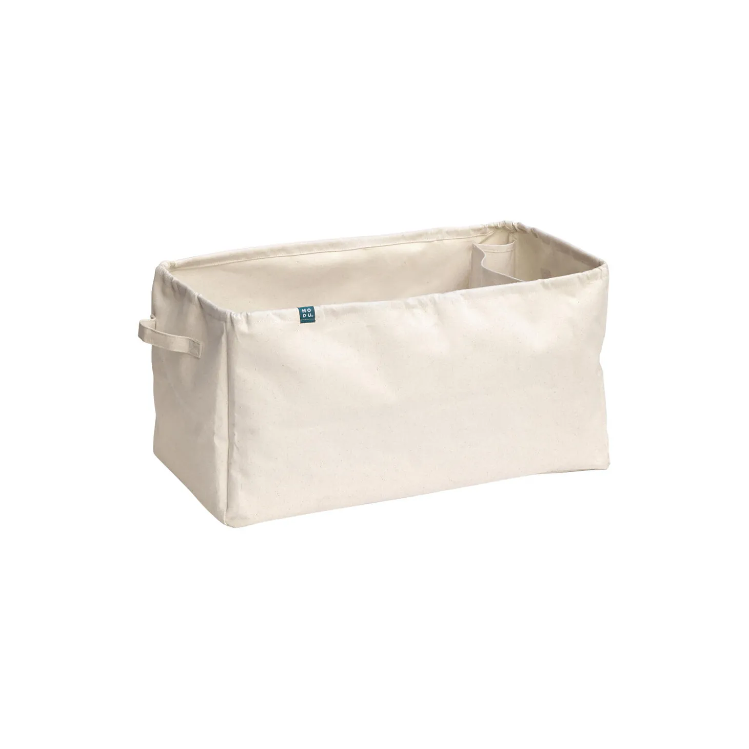 Stilren opbevaringskurv fra MODU. EN kurv der holder styr og orden på dit MODU, når der ikke er i brug. Kurven har en smart inderlomme til pinde og hjul.100% genanvendt bomuld. Farve: Canvas. Mål: 41 x 65 x 50.
