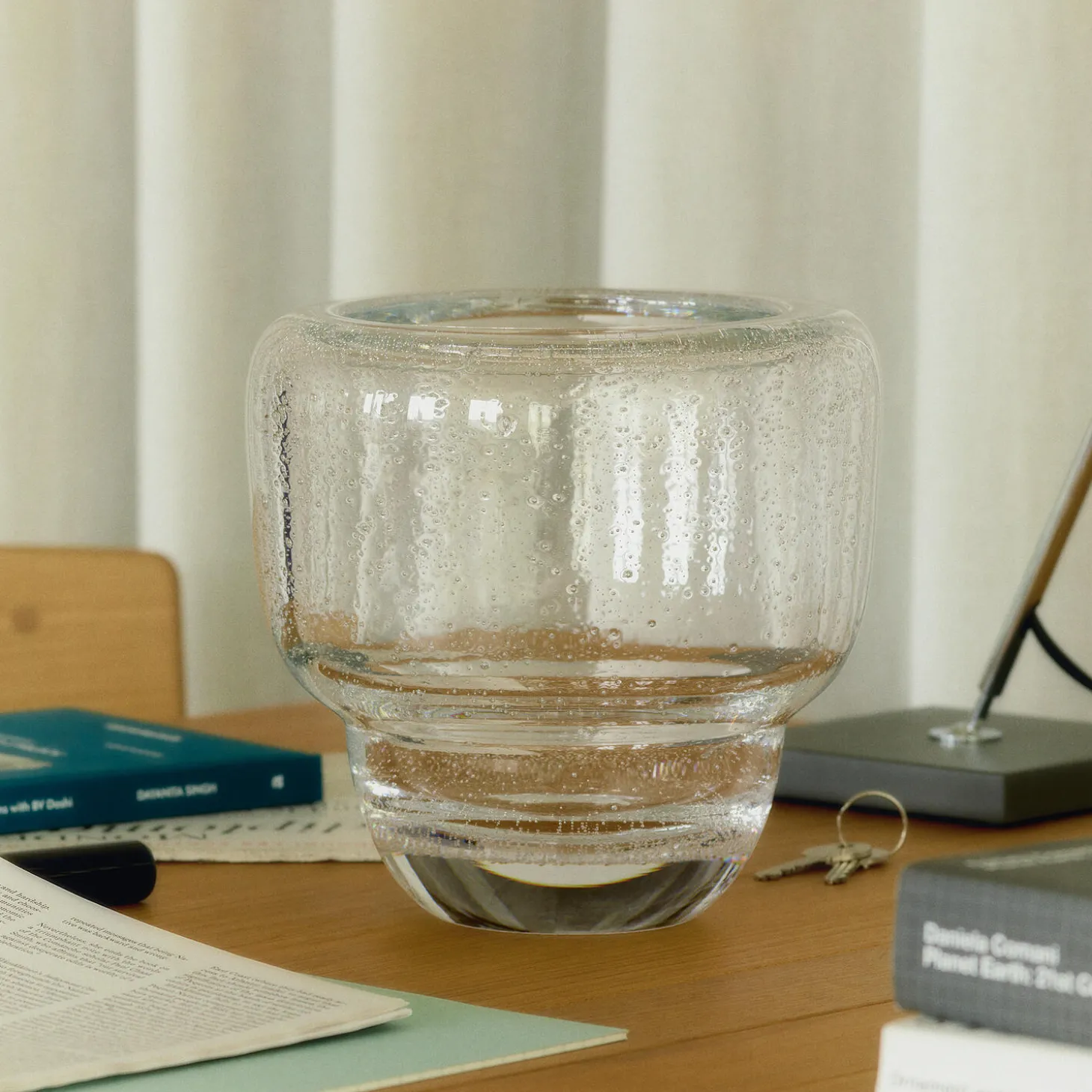 Orb Vase og Conical Vase er mundblæst i klart krystalglas af erfarne glaspustere på et mere end 100 år gammelt glaspusteri i Polen, hvor håndværket er blevet forfinet gennem generationer. Hver vase formes i hånden, hvilket gør dem unikke, mens de indkapslede luftbobler i glasset fremhæver det håndlavede udtryk og tilfører en skulpturel dybde. Vaserne fungerer både som dekorative kunstobjekter og til blomster – en hyldest til det enkle formsprog og det traditionsrige håndværk.