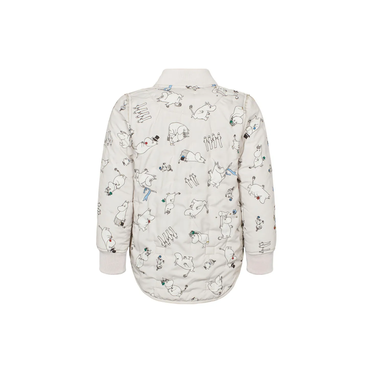 Termojakke med Moomin print med smal pasform og med lommer i siden. Jakken kan ved hjælp af små velcro detaljer bukkes op bagpå, hvis man ikke ønsker at den er længere her. Jakken lukkes med lynlås.