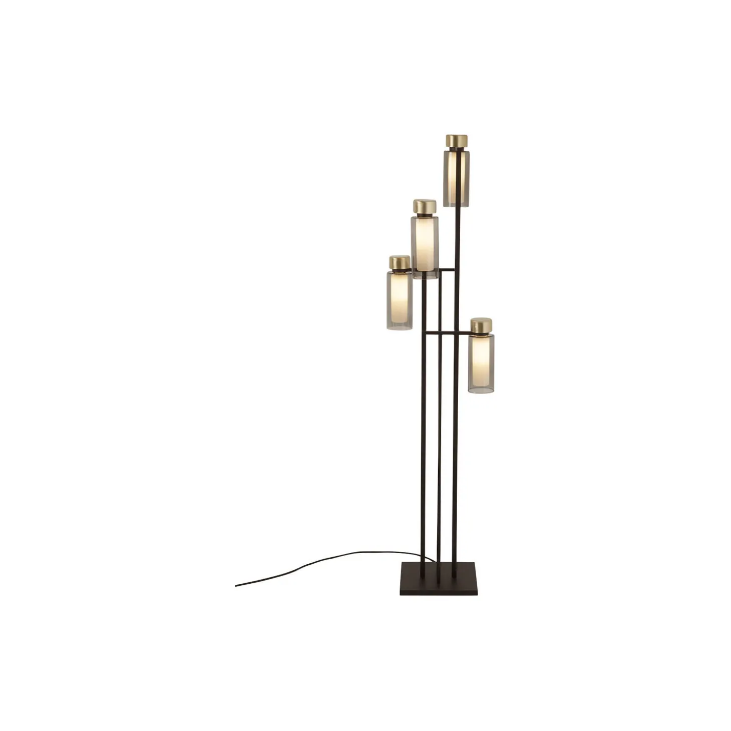 OSMAN gulvlampe i aluminium, børstet messing og glas fra Tooy. Farve: mat sort/børstet messing/røget glas. Mål: H: 110 x Ø 38 cm. Lyskilde: 4 x maks. 10W E14 220/240V. Design: Corrado Dotti.