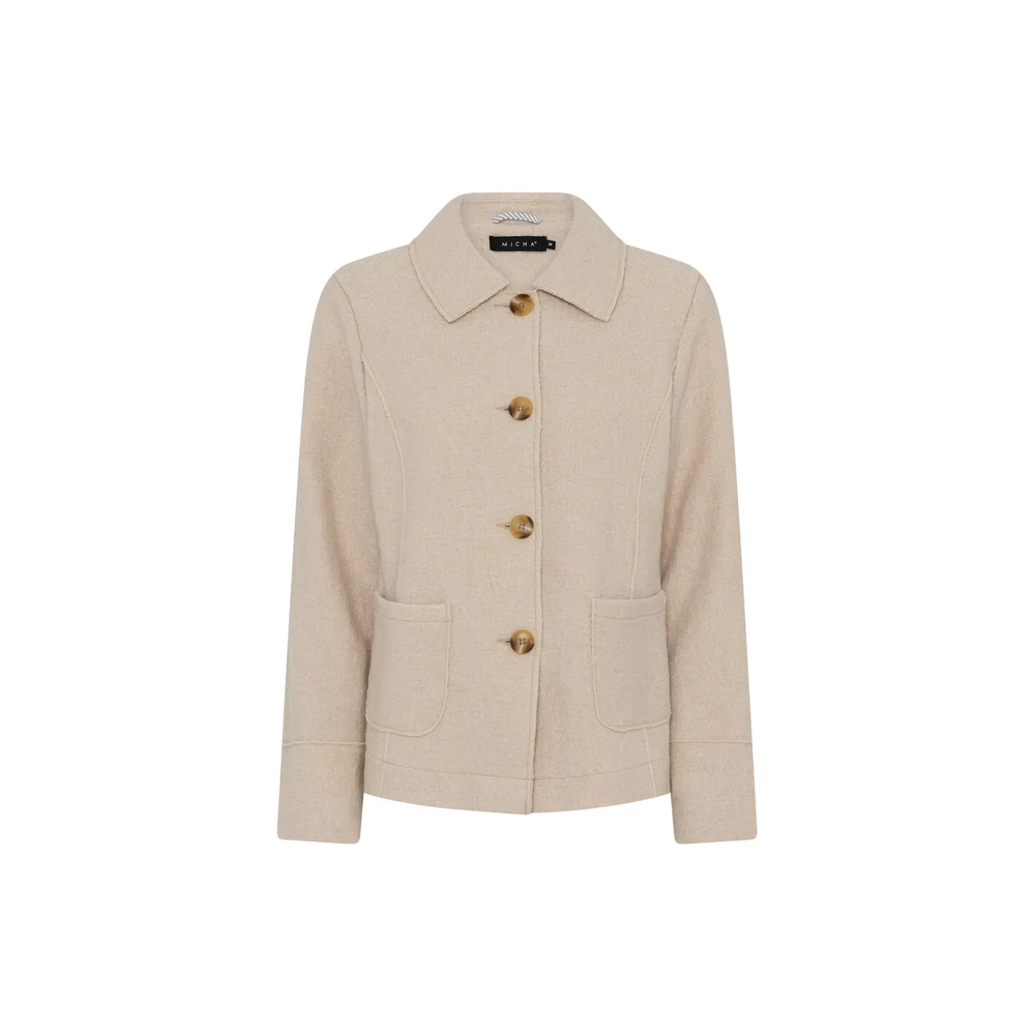 Kort jakke i klassisk snit med krave, knaplukning og lommer foran. Et stilrent valg til mange anledninger.