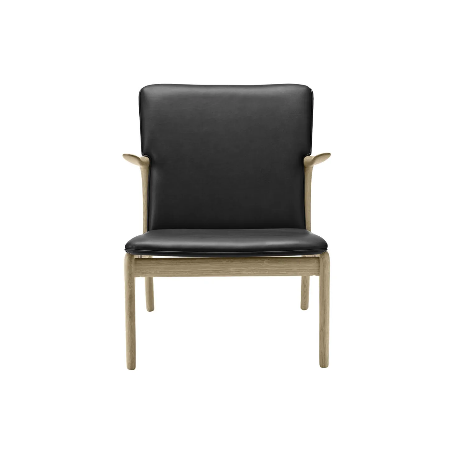 OW124 Beak Chair loungestol i sæbebehandlet eg med sæde og ryg polstret i Sif 98 anilinlæder fra Carl Hansen & Søn. Farve: sæbebehandlet eg/sort. Mål: H: 79 x B: 65 x D: 73 cm. Siddehøjde: 40 cm. Design: Ole Wanscher.