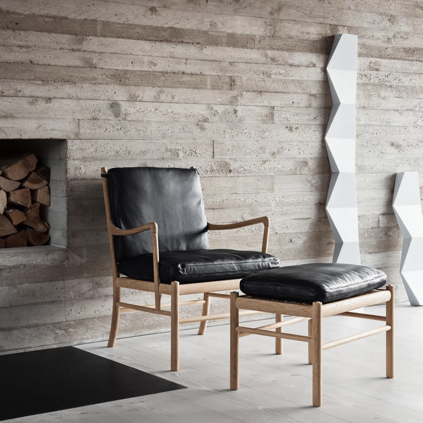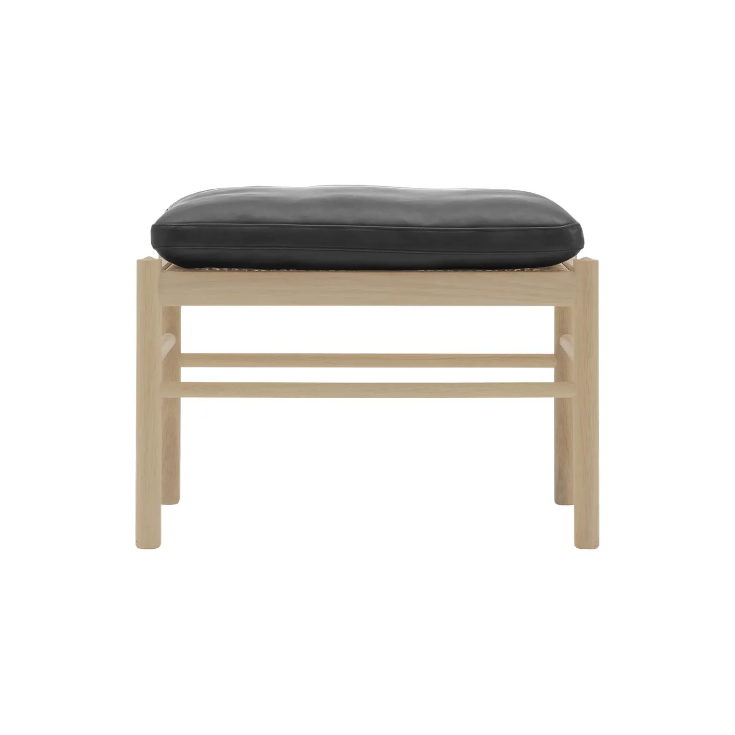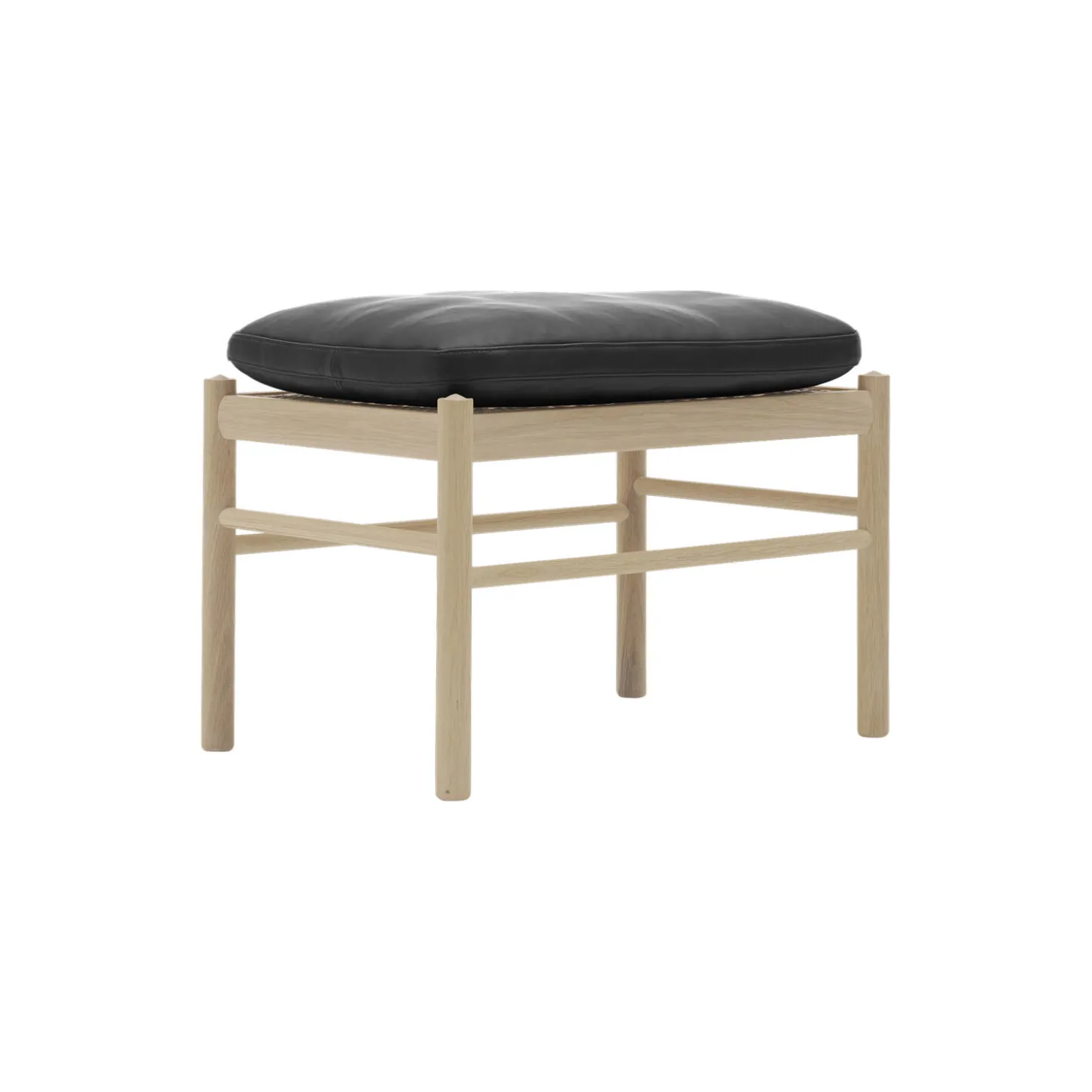 OW149F Colonial skammel i hvidolieret eg med hynder polstret i Thor 301 læder fra Carl Hansen & Søn. Farve: hvidolieret eg/sort. Mål: H: 46 x B: 60 x D: 40 cm. Siddehøjde: 46 cm. Design: Ole Wanscher.