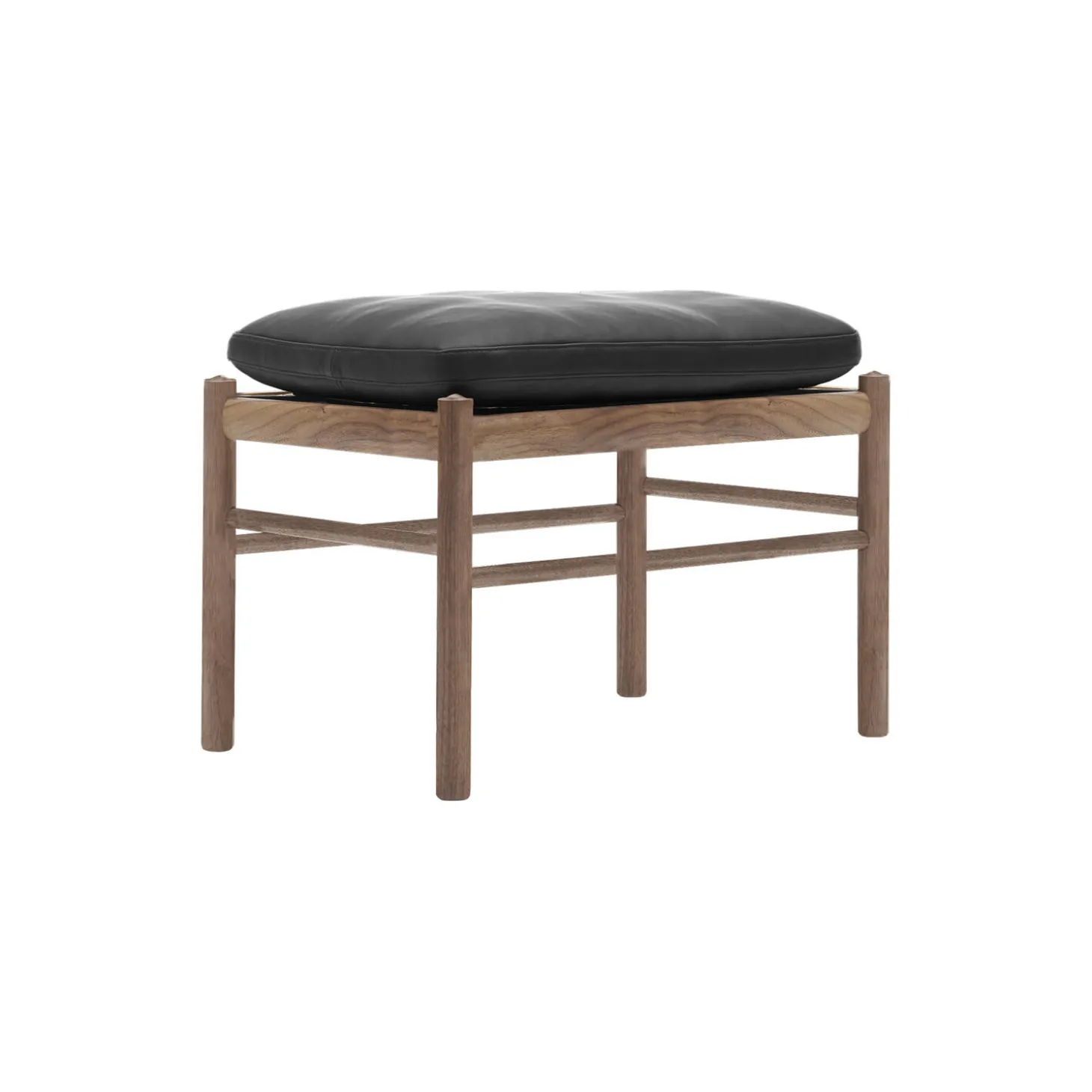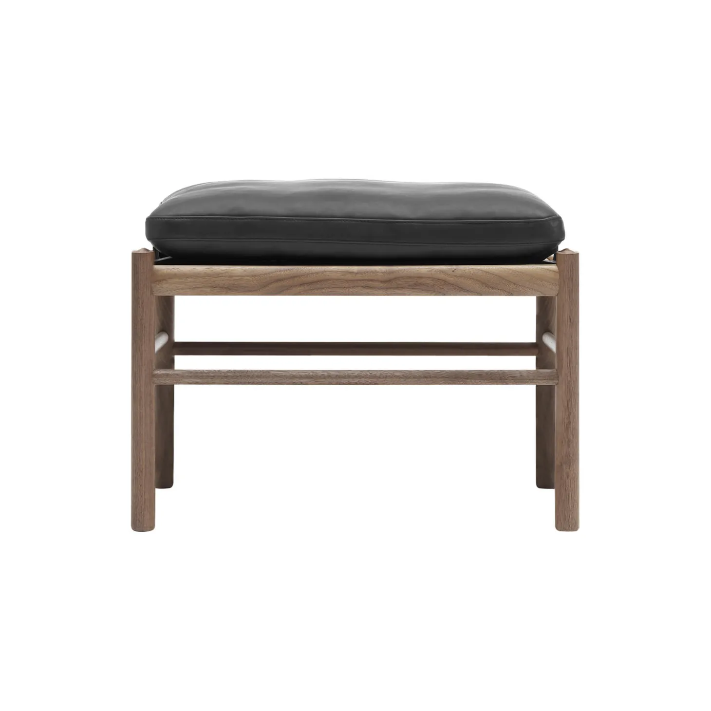 OW149F Colonial skammel i olieret valnød med hynder polstret i Sif 98 anilinlæder fra Carl Hansen & Søn. Farve: olieret valnød/sort. Mål: H: 46 x B: 60 x D: 40 cm. Siddehøjde: 46 cm. Design: Ole Wanscher.