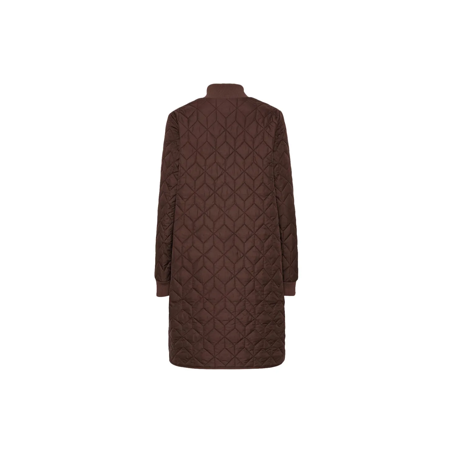 Long quilted A-shaped coat with soft padding inside. This style has a special quilt pattern and is slightly longer at back. Features include slits at sides with logo snap button closure, two-way zipper at front, soft rib collar and cuffs. This style can be used as a transitional piece or as midlayer under your raincoat for warmth.