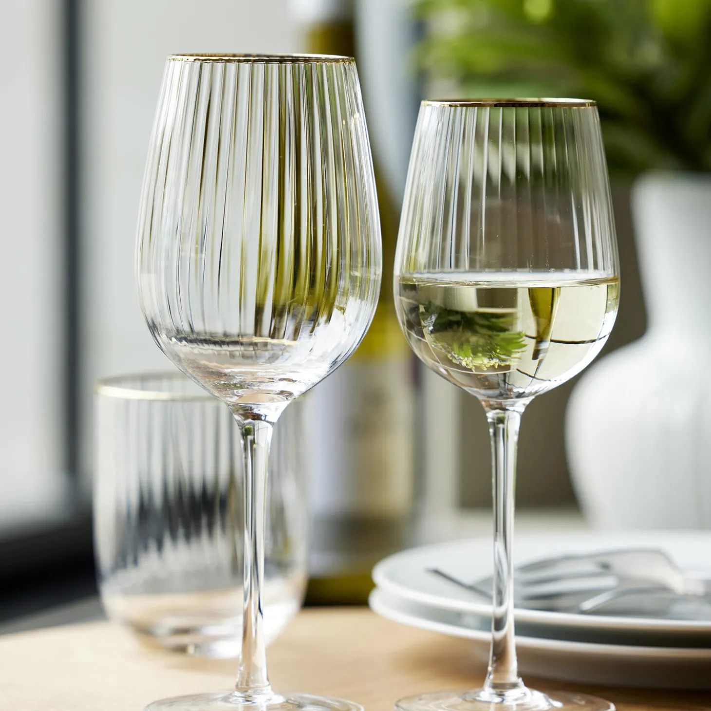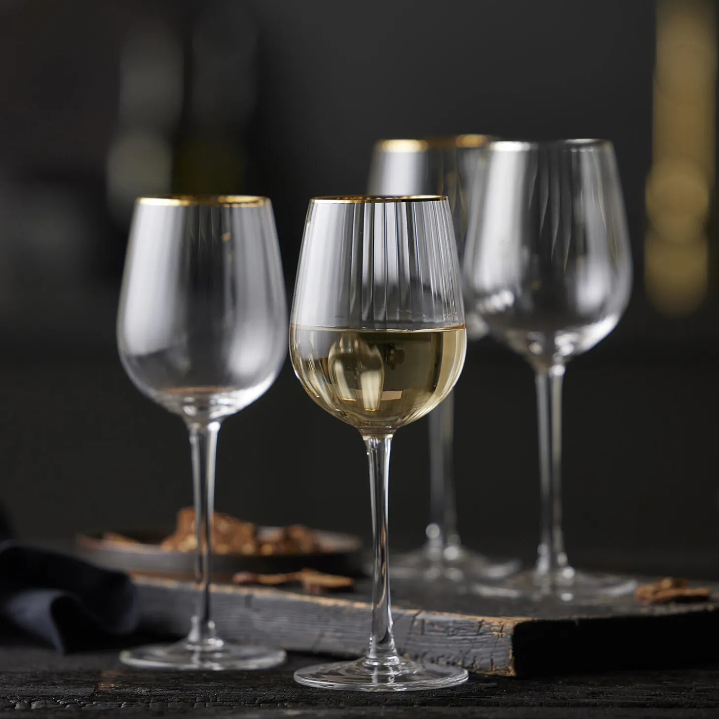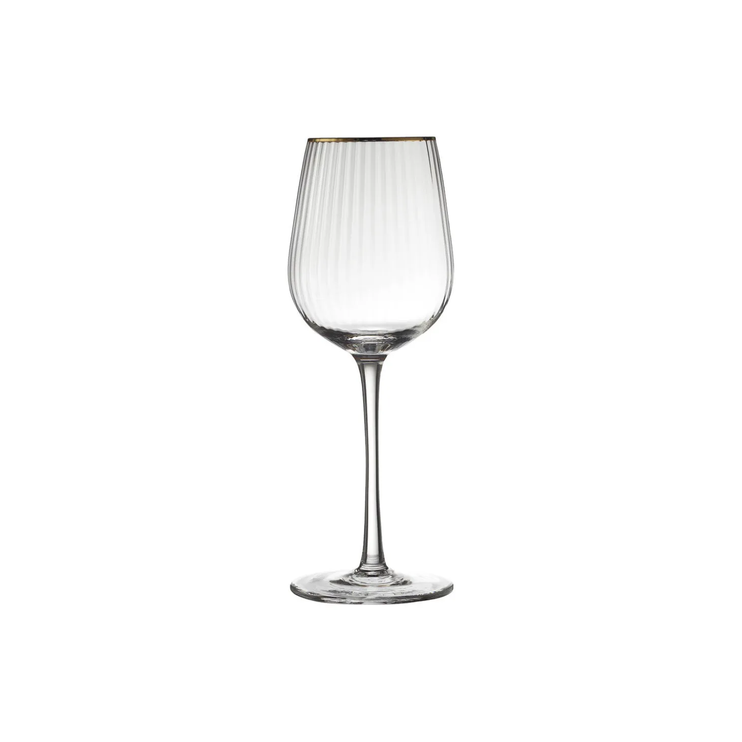 Smukt vinglas med bløde, rundede former. Det elegante, riflede design med en fin guldkant giver glasset et flot vintagelook, der samtidig afspejler tidens trends. Server din bedste vin i glasset og lad de fine facetter reflektere lyset og glassets indhold på smukkeste vis.