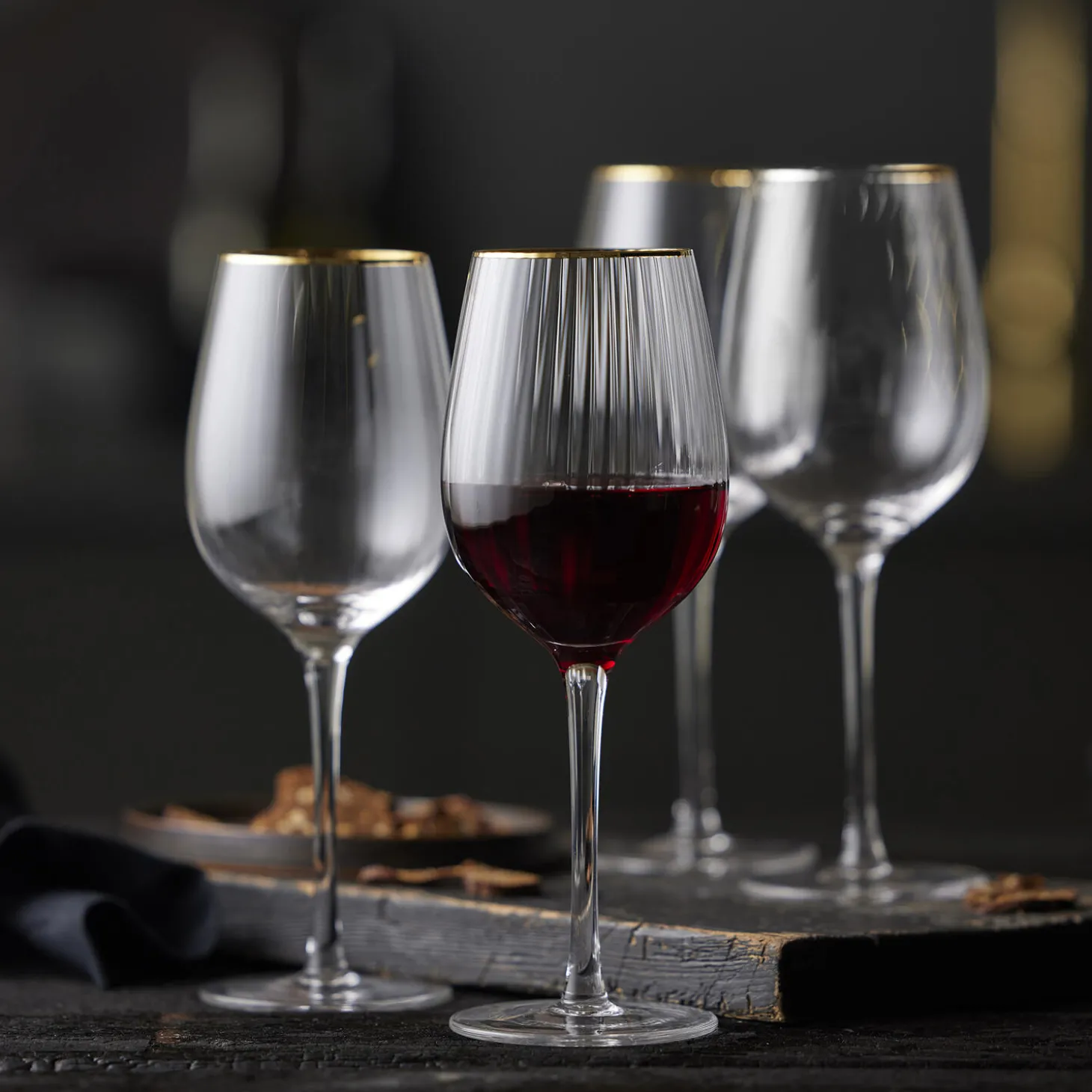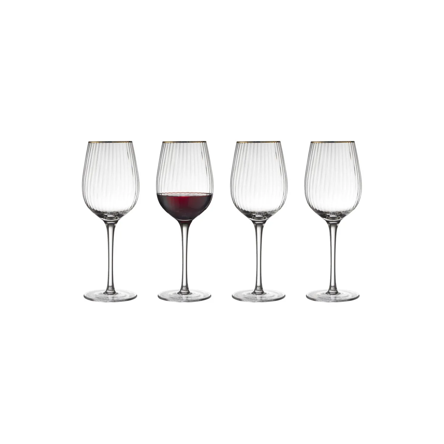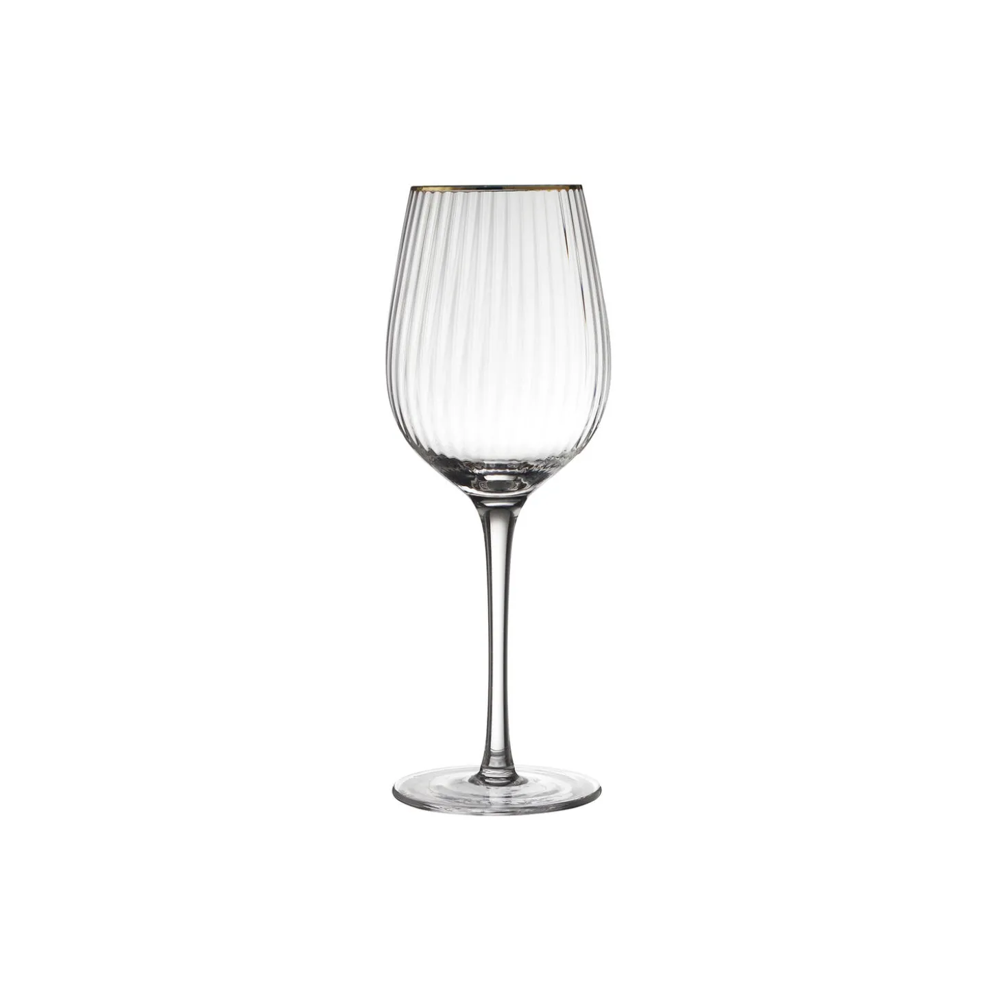 Smukt vinglas med bløde, rundede former. Det elegante, riflede design med en fin guldkant giver glasset et flot vintagelook, der samtidig afspejler tidens trends. Server din bedste vin i glasset og lad de fine facetter reflektere lyset og glassets indhold på smukkeste vis.