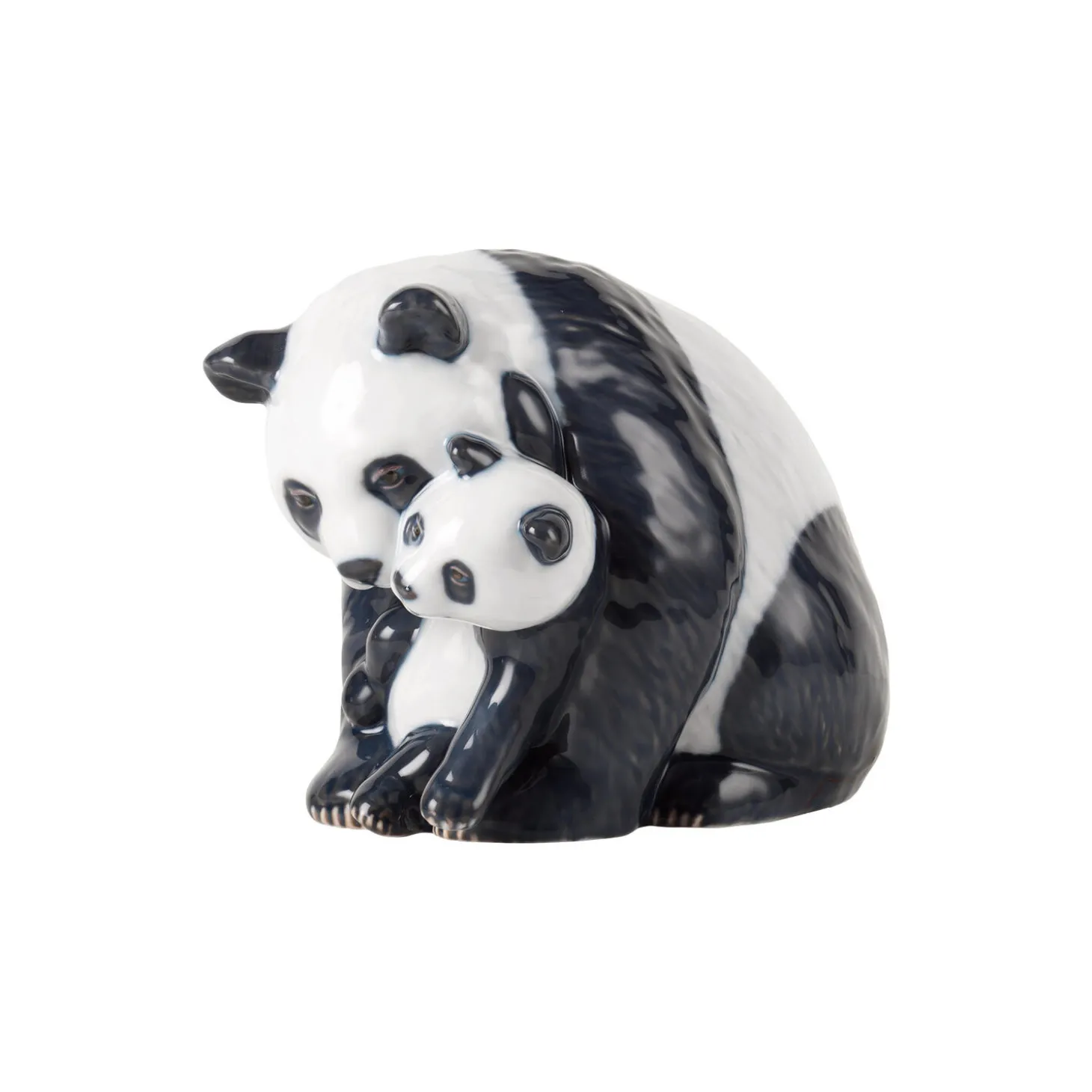 Panda-figuren blev en del af Royal Copenhagens sortiment for første gang i 1994 og nu har den smukke bjørn fundet vej tilbage til vores permanente kollektion. De to panda-figurer afbilder den elskelige bjørn, der nyder et bambus-måltid, og en panda-mor der krammer sin unge.