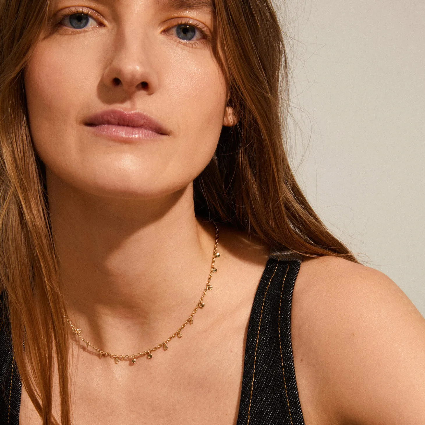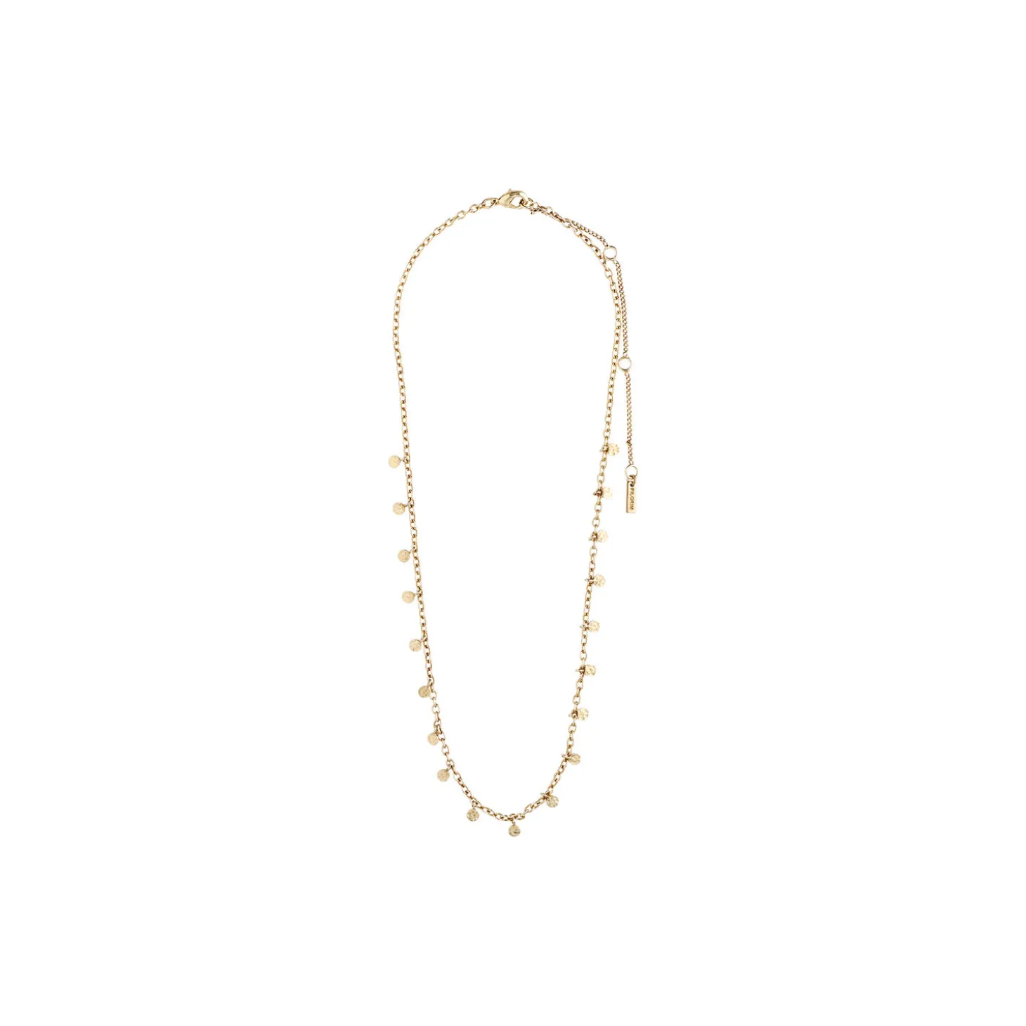 Feminin guldbelagt halskæde med små blanke runde vedhæng langs kæden. Den delikate halskæde er 40 cm lang og har 9 cm forlængerkæde. Designet er inspireret af klassiske eksotiske smykker, og halskæden er perfekt som kontrast til et råt outfit. Lad din femininitet stråle igennem med denne skønne klassiker.