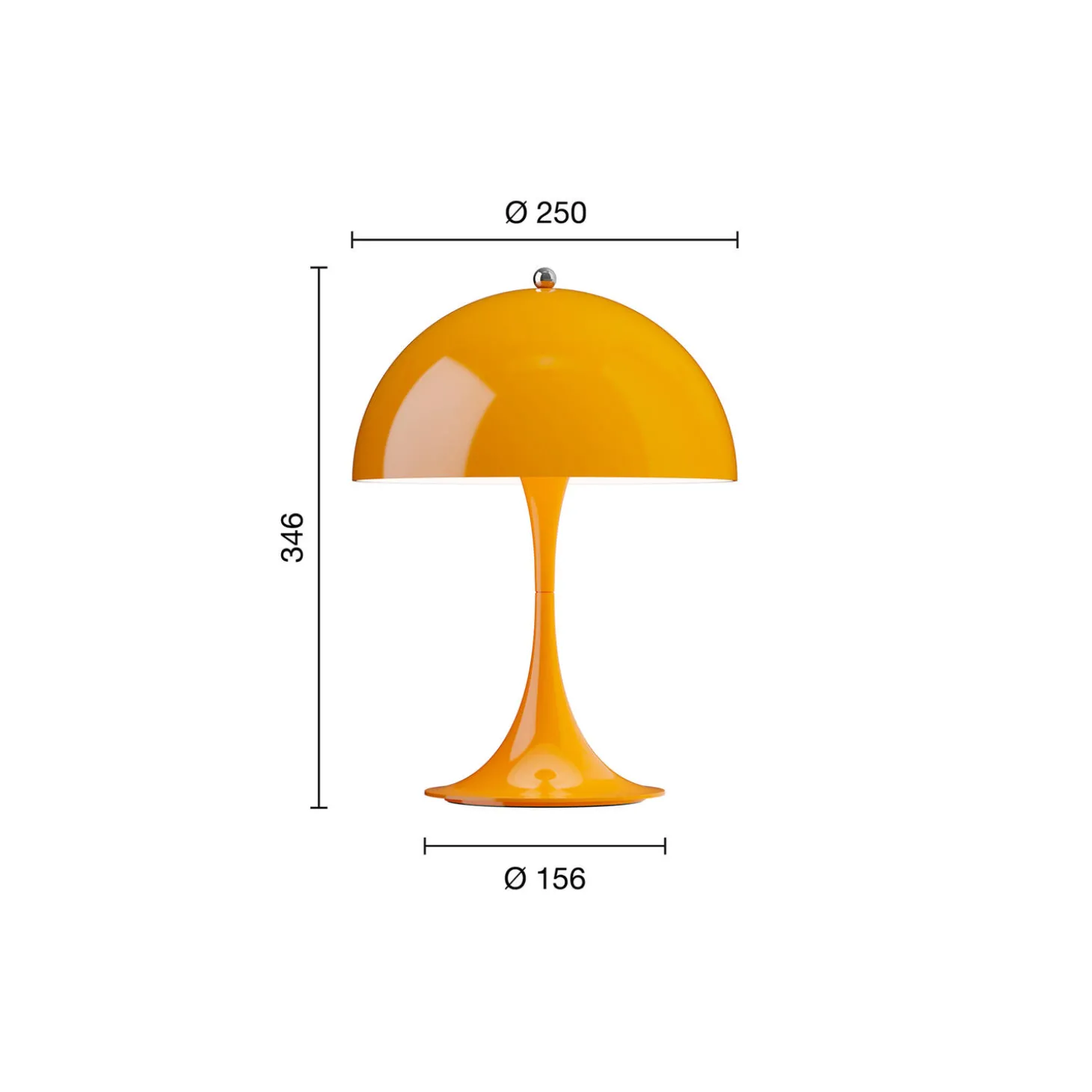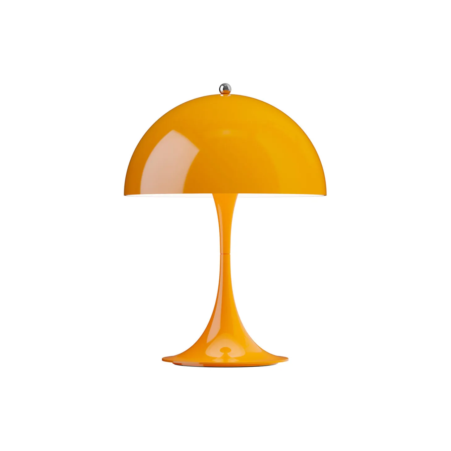 Den bærbare lampe har en hvid akryk opalskærm, der giver et diffust lys, det blændfri lys rettes nedad på den trompetformede fod, der er designet til at reflektere lyset opad.