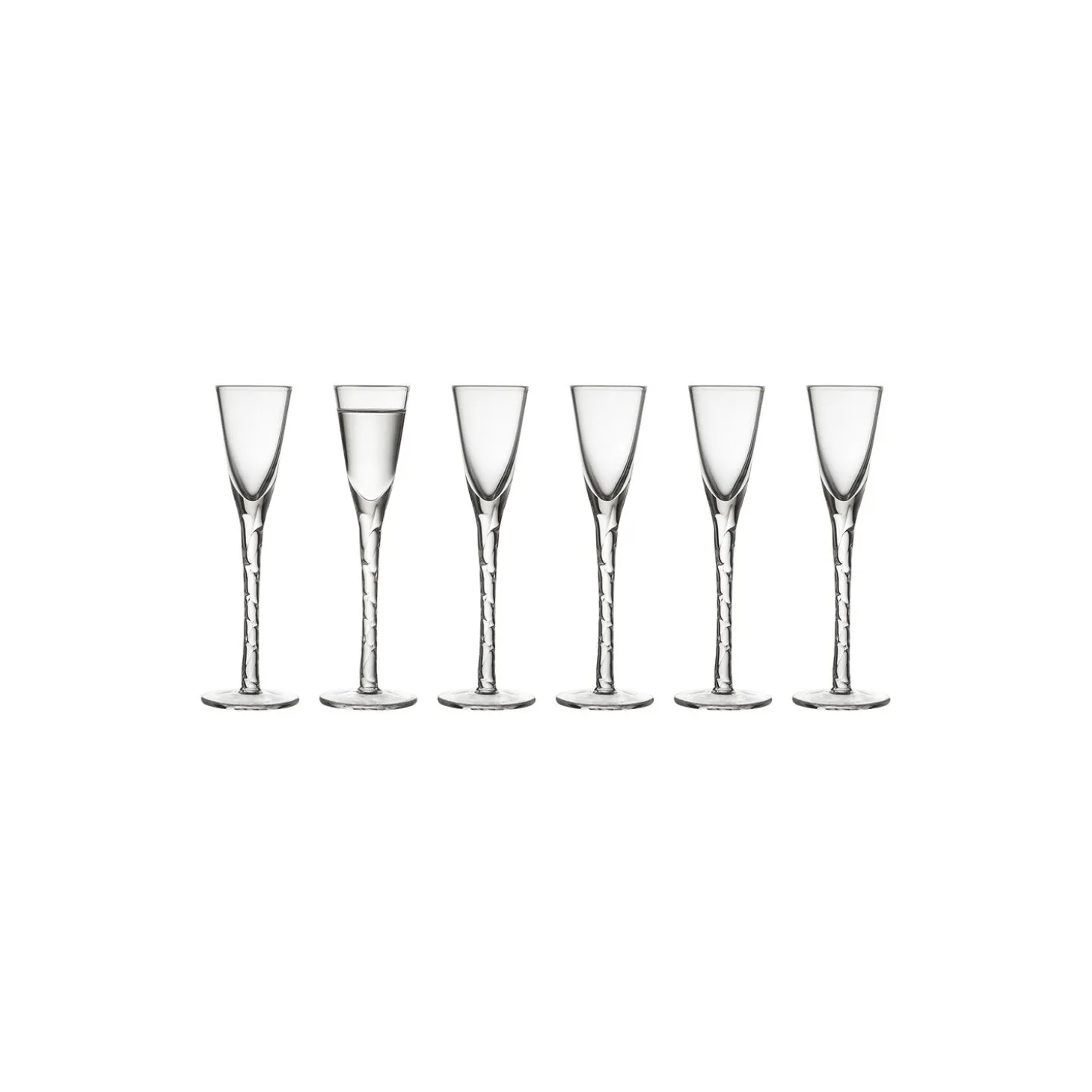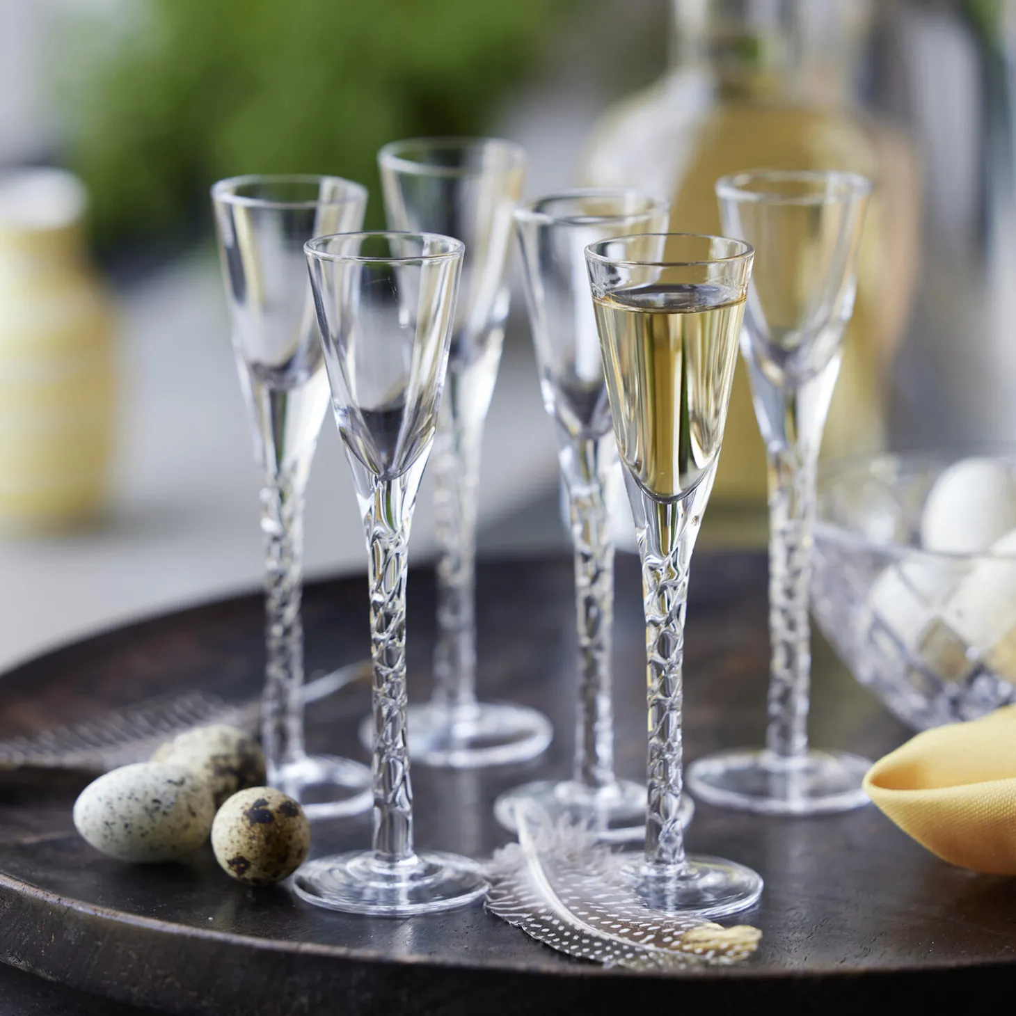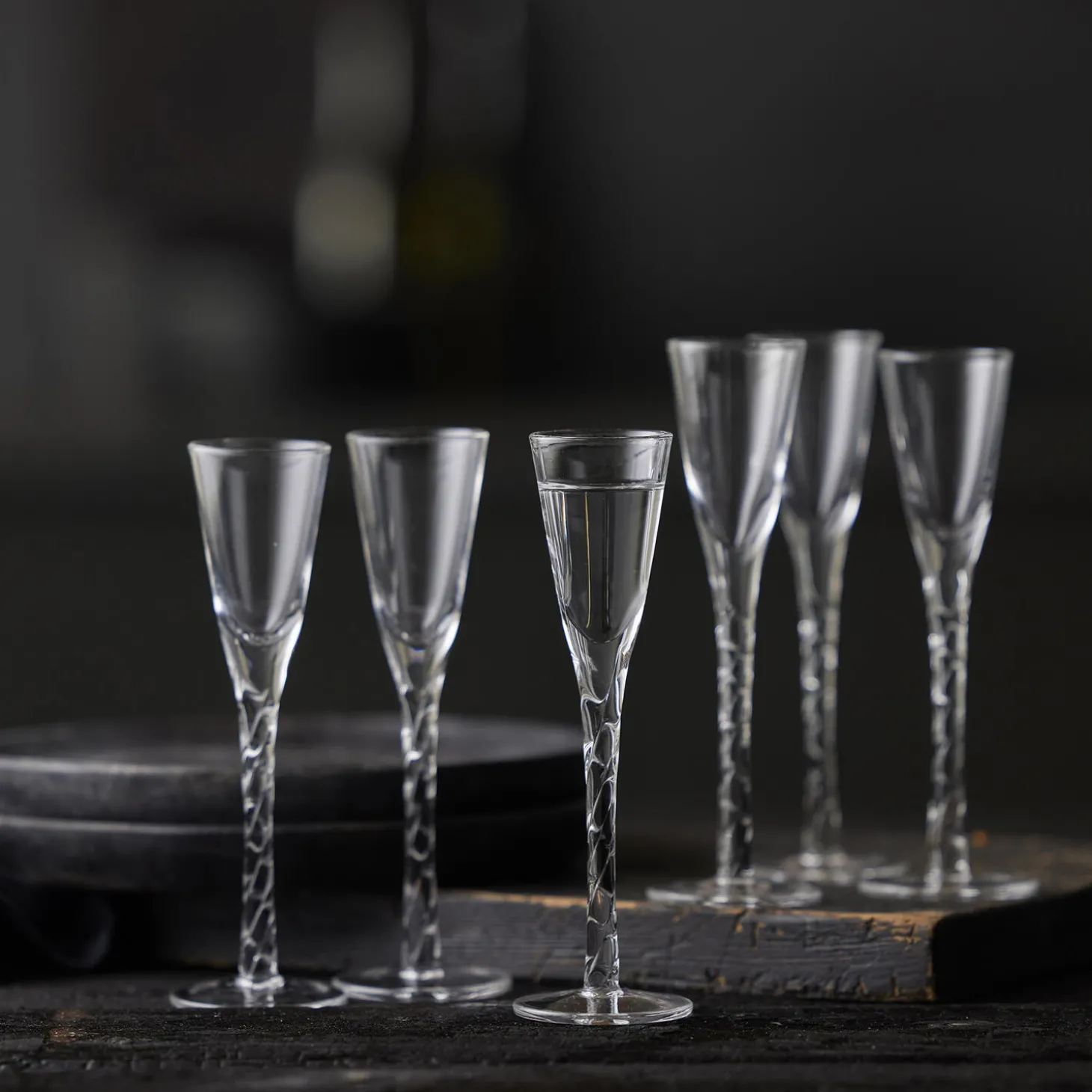 6 håndlavede og mundblæste snapseglas med hånddrejet snoet stilk bidrager til en god stemning ved bordet. Snapseglassene i klart glas har en flot, klassisk udformning.