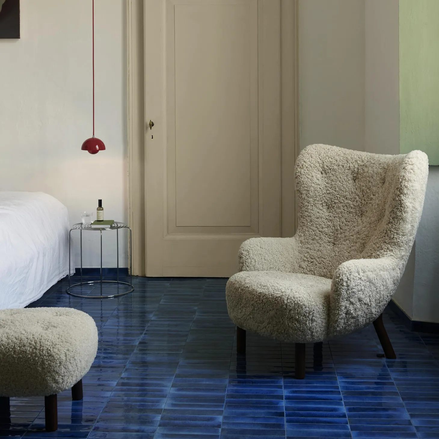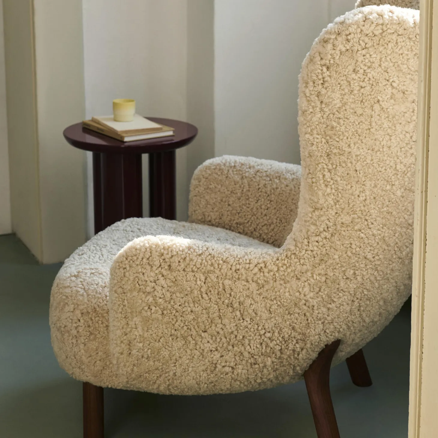 - Materiale: upholstery in Sheepskin Moonlight fabric and frame in oiled walnut