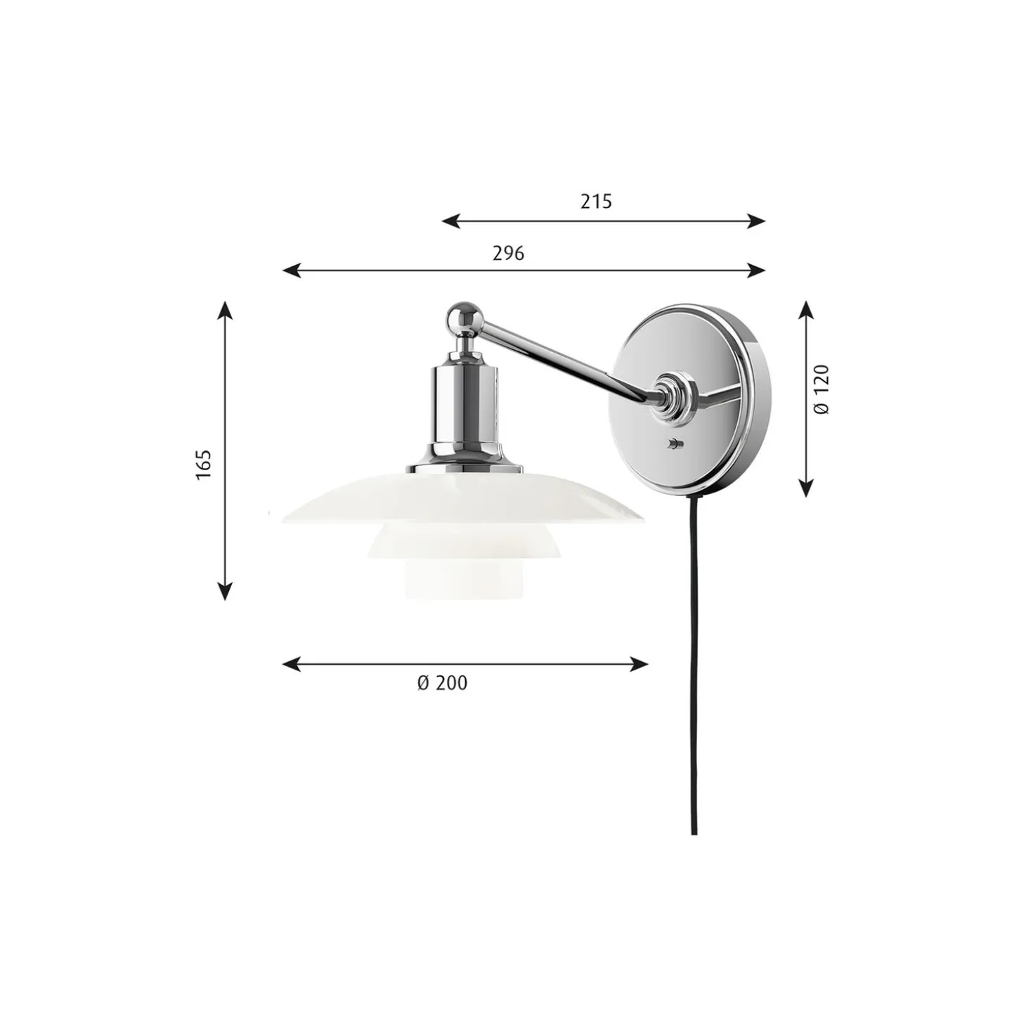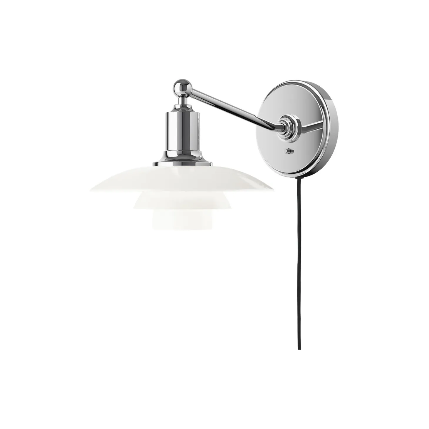 PH 2/1 væglampe i mundblæst opalglas med fatningshus og arm i højglansforkromet messing og aluminium fra Louis Poulsen. Farve: krom. Mål: H: 16,5 x D: 29,6 x Ø 20 cm. Lyskilde: 20W E14. Design: Poul Henningsen.