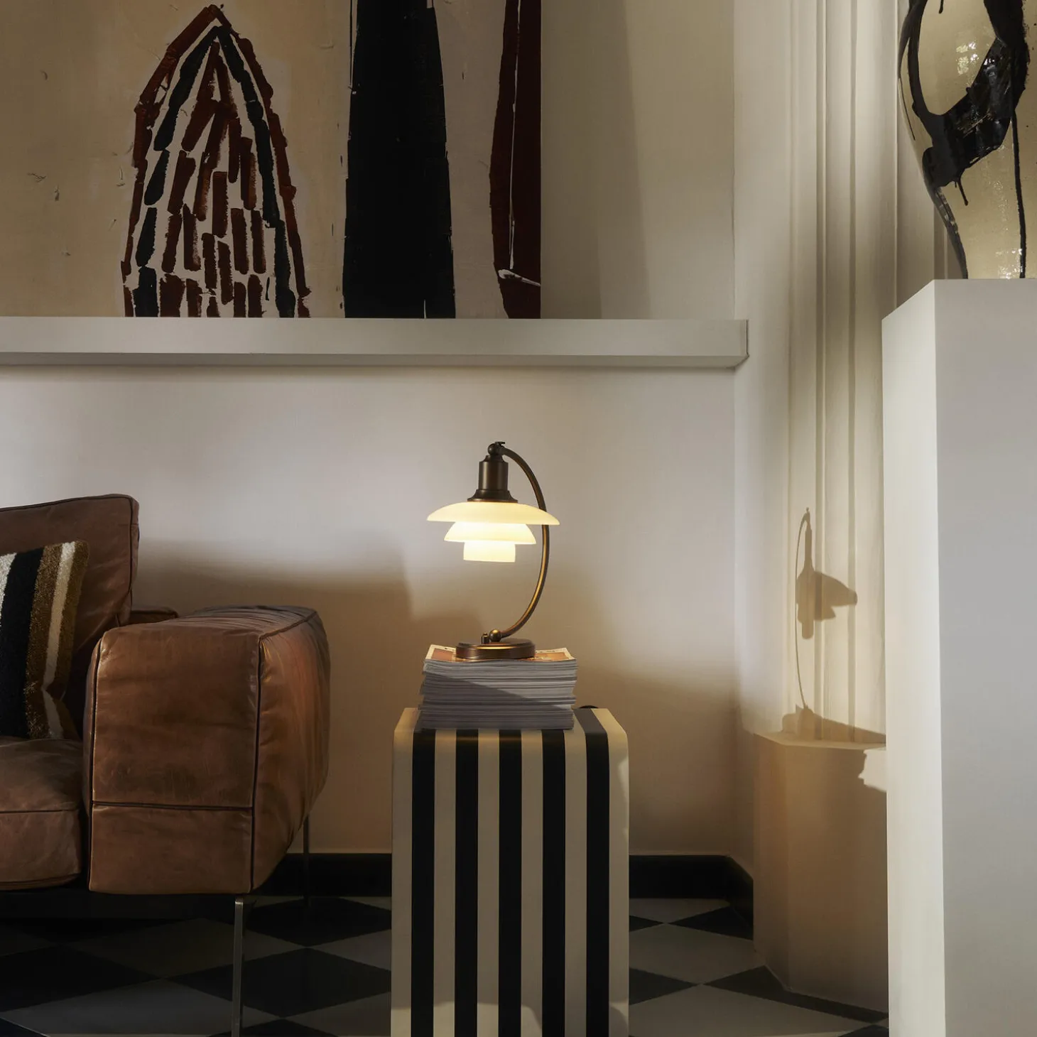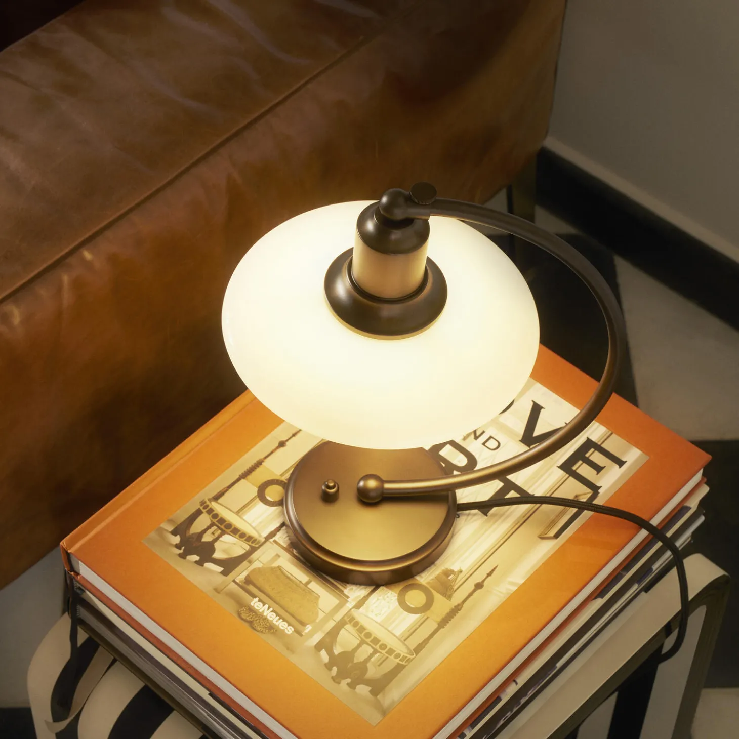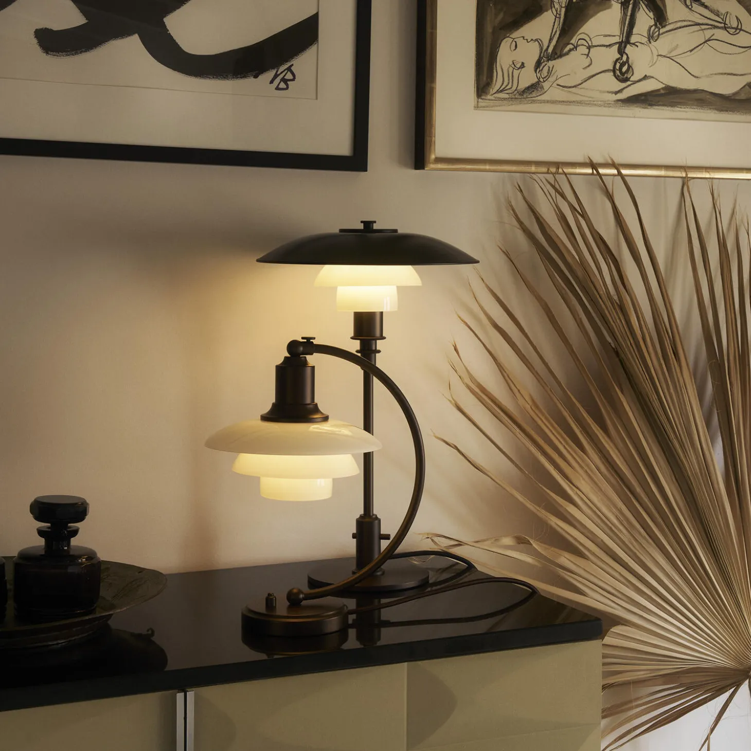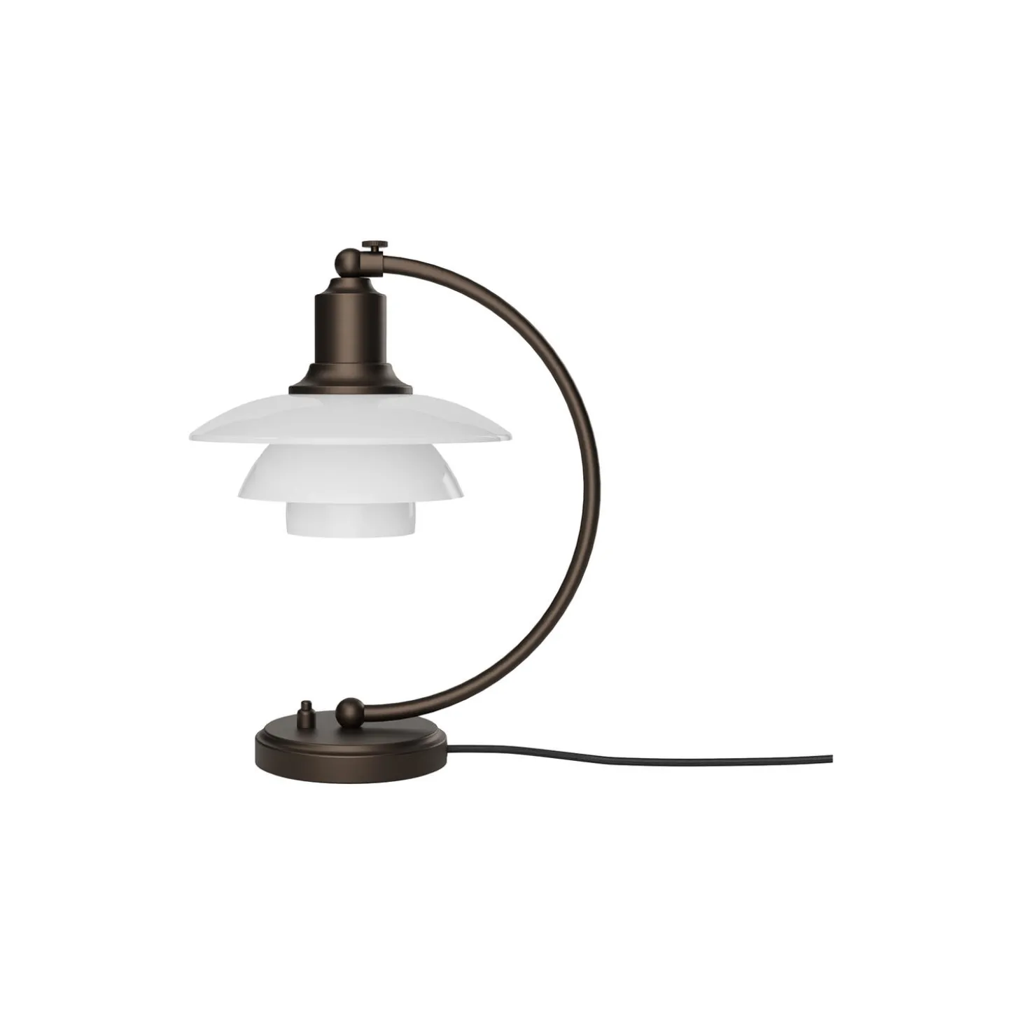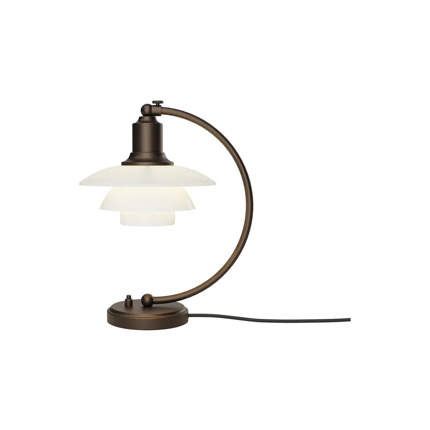 PH 2/2 Luna Aged Brass Opal Bordlampe i bruneret messing har Poul Henningsens karakteristiske treskærmssystem med skærme af mundblæst opalhvidt glas, der er blankt på ydersiden og sandblæst mat på undersiden. Det giver både et perfekt nedadrettet lys og et blødt, diffust lys rundt om lampen, som skaber stemning.