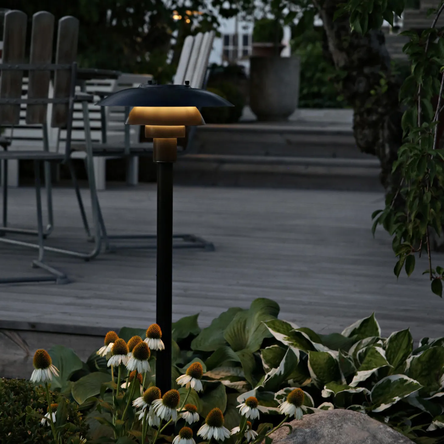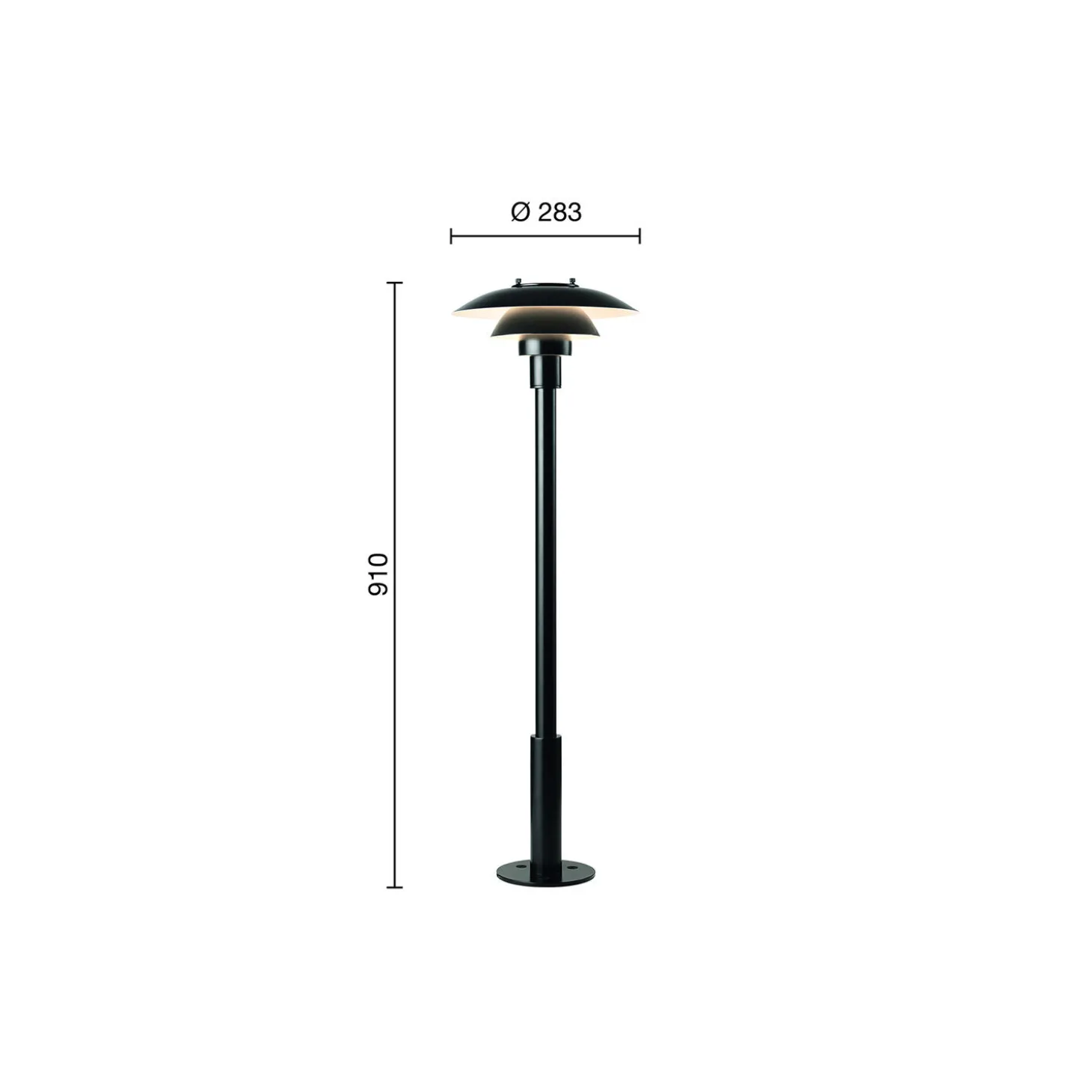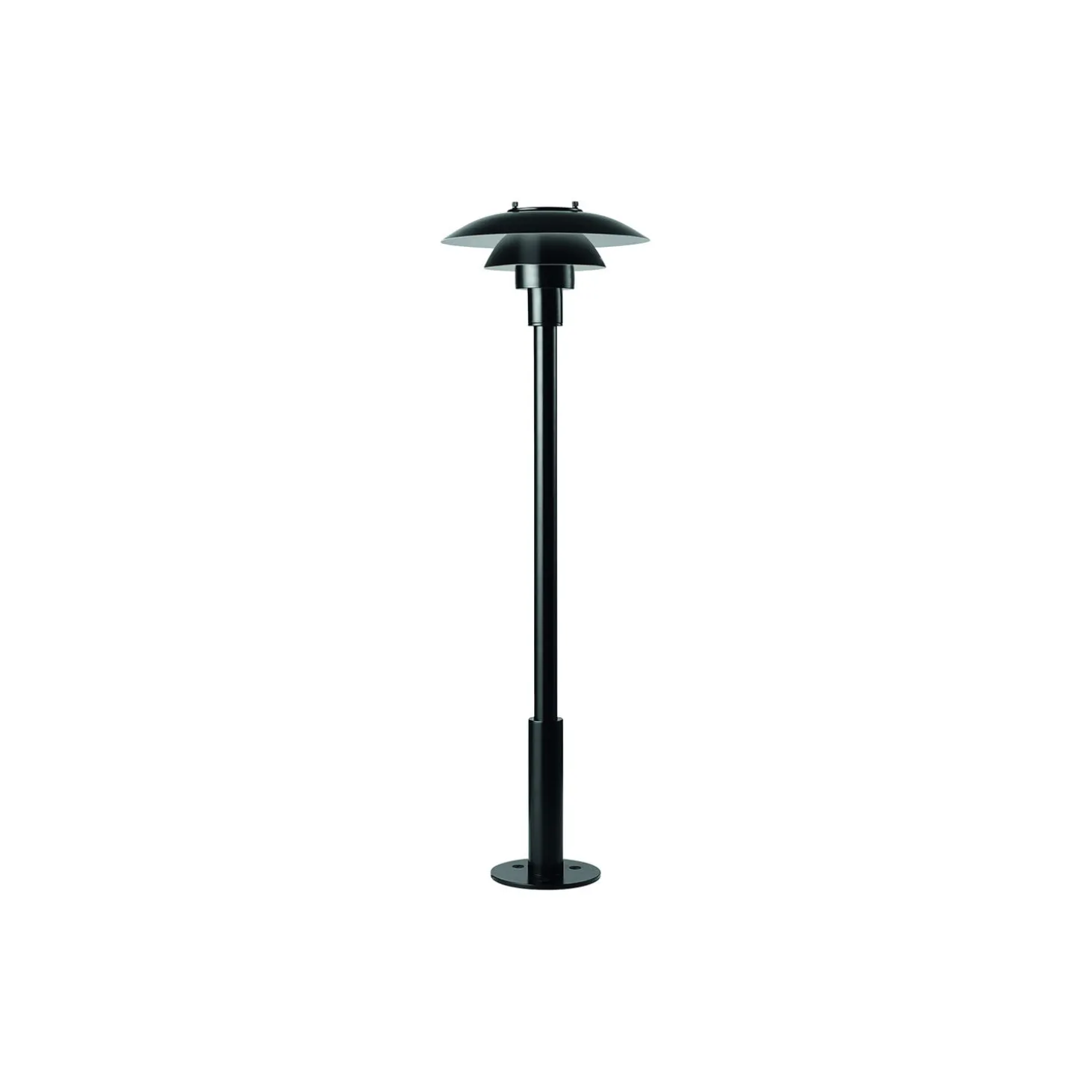 - Materiale: Overskærm: Optrukket rustfrit stål. Midter-/underskærm: Optrukket rustfrit stål. Skærmholder: Formpresset glasfiber. Mast: Rustfrit stål. Overflade: Sort, pulverlakeret.
