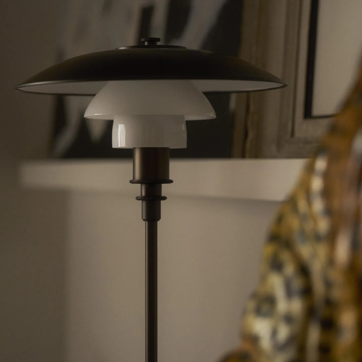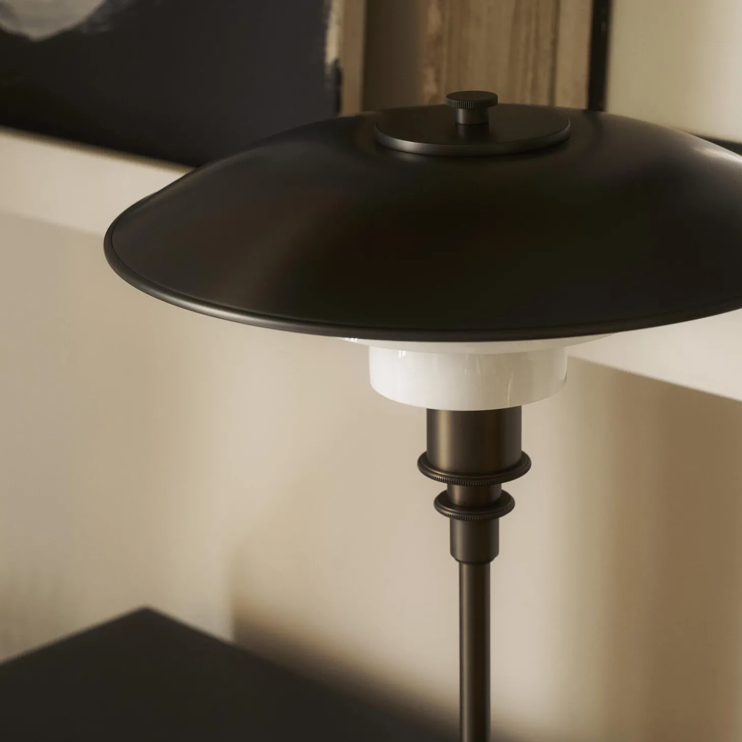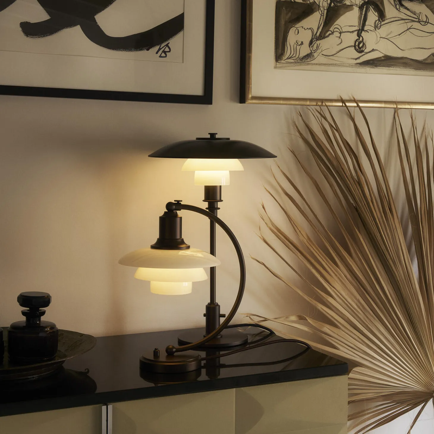 PH 3/2 Aged Brass Opal Glass Bordlampe i bruneret messing er baseret på Poul Henningsens reflekterende treskærmssystem. Den er kendetegnet af at have en topskærm i bruneret messing med en hvidmalet inderside, der giver et behageligt nedadrettet og blændfrit lys. Midter- og underskærme er fremstillet af mundblæst opalhvidt glas i tre lag, der er blankt på oversiden og sandblæst mat på undersiden og derfor giver en blødere, mere ensartet og stemningsfuld lysfordeling.