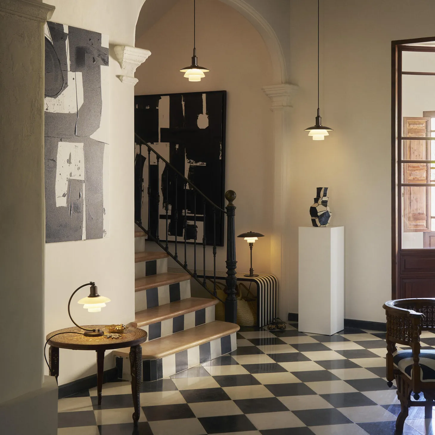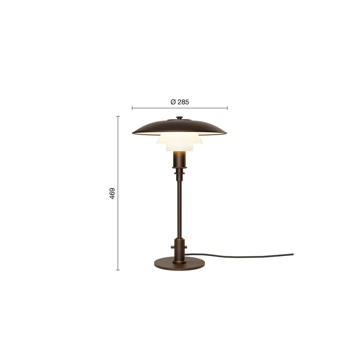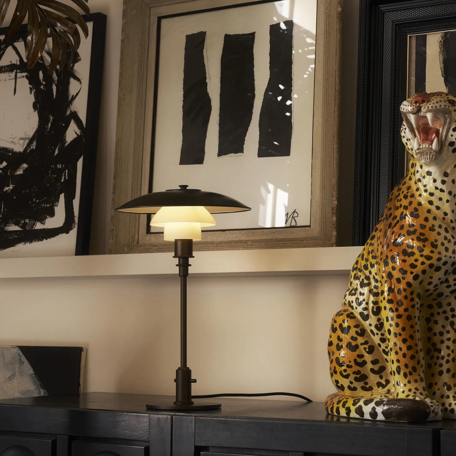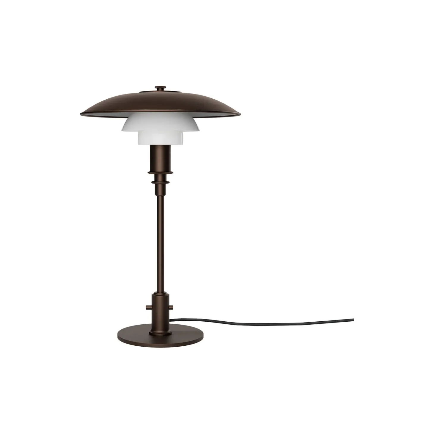 PH 3/2 Aged Brass Opal Glass Bordlampe i bruneret messing er baseret på Poul Henningsens reflekterende treskærmssystem. Den er kendetegnet af at have en topskærm i bruneret messing med en hvidmalet inderside, der giver et behageligt nedadrettet og blændfrit lys. Midter- og underskærme er fremstillet af mundblæst opalhvidt glas i tre lag, der er blankt på oversiden og sandblæst mat på undersiden og derfor giver en blødere, mere ensartet og stemningsfuld lysfordeling.