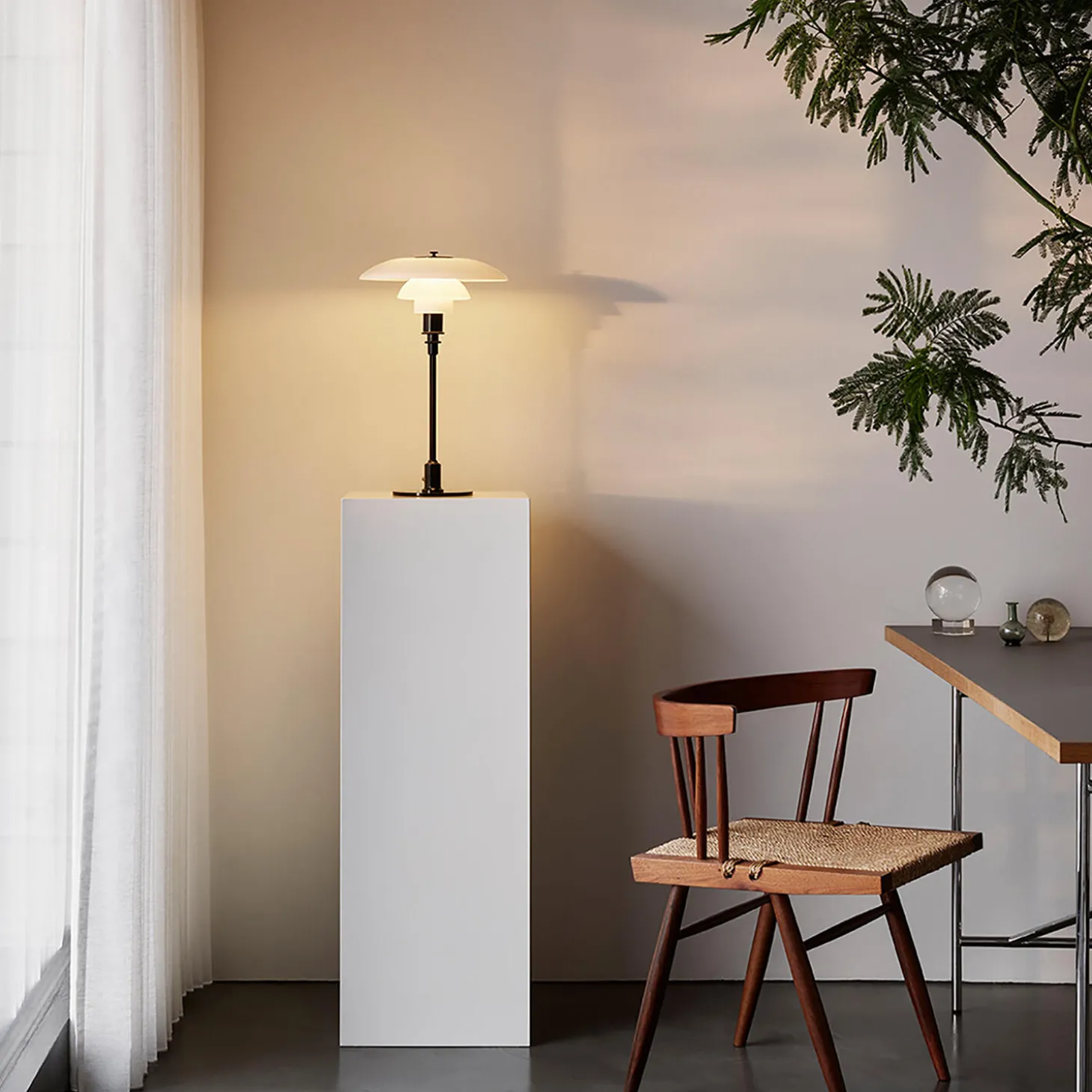 Bordlampen giver en blød, harmonisk og behagelig lysfordeling med sit mundblæste hvide opalglas i tre lag, der primært leder lyset nedad. Poul Henningsen designede lampen ud fra sit berømte treskærmssystem, som han skabte i 1925 for at skabe fremragende blændfri belysning. Den første lampe med flerskærmssystemet blev lavet i samarbejde med Louis Poulsen til Paris_x005fudstillingen samme år. ‘Paris-lampen’ vandt guld. Henningsen havde en videnskabelig tilgang til lys og fortsatte med at designe armaturer baseret på det samme system. Han brugte den logaritmiske spiral som fundament og opnåede en meget ensartet fordeling af lyset med treskærmssystemet, som sammen med en spredt refleksion gennem glasset gjorde det muligt at styre både blænding og skygge. Hvert PH-lampenummer refererer til størrelsen på lampens skærme. PH 3/2 Bord består af en overskærm på ca. 30 cm og underskærme fra 2/2-versionen.