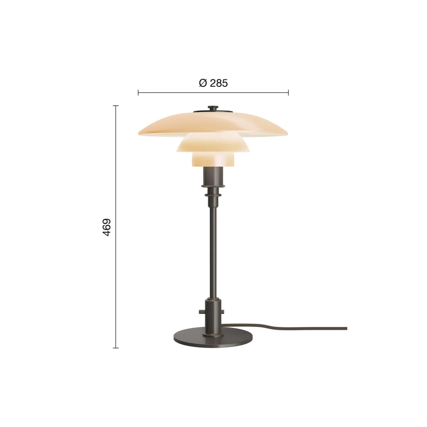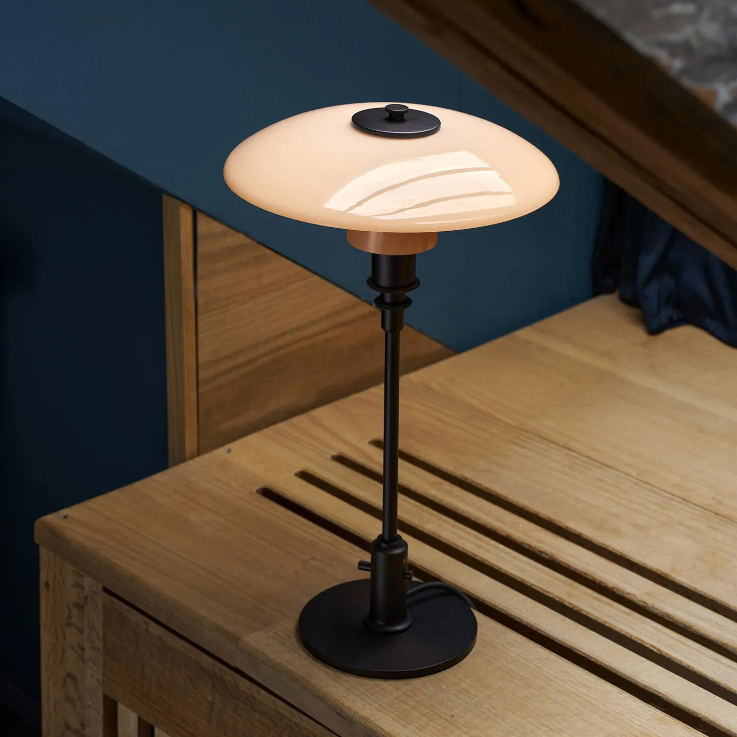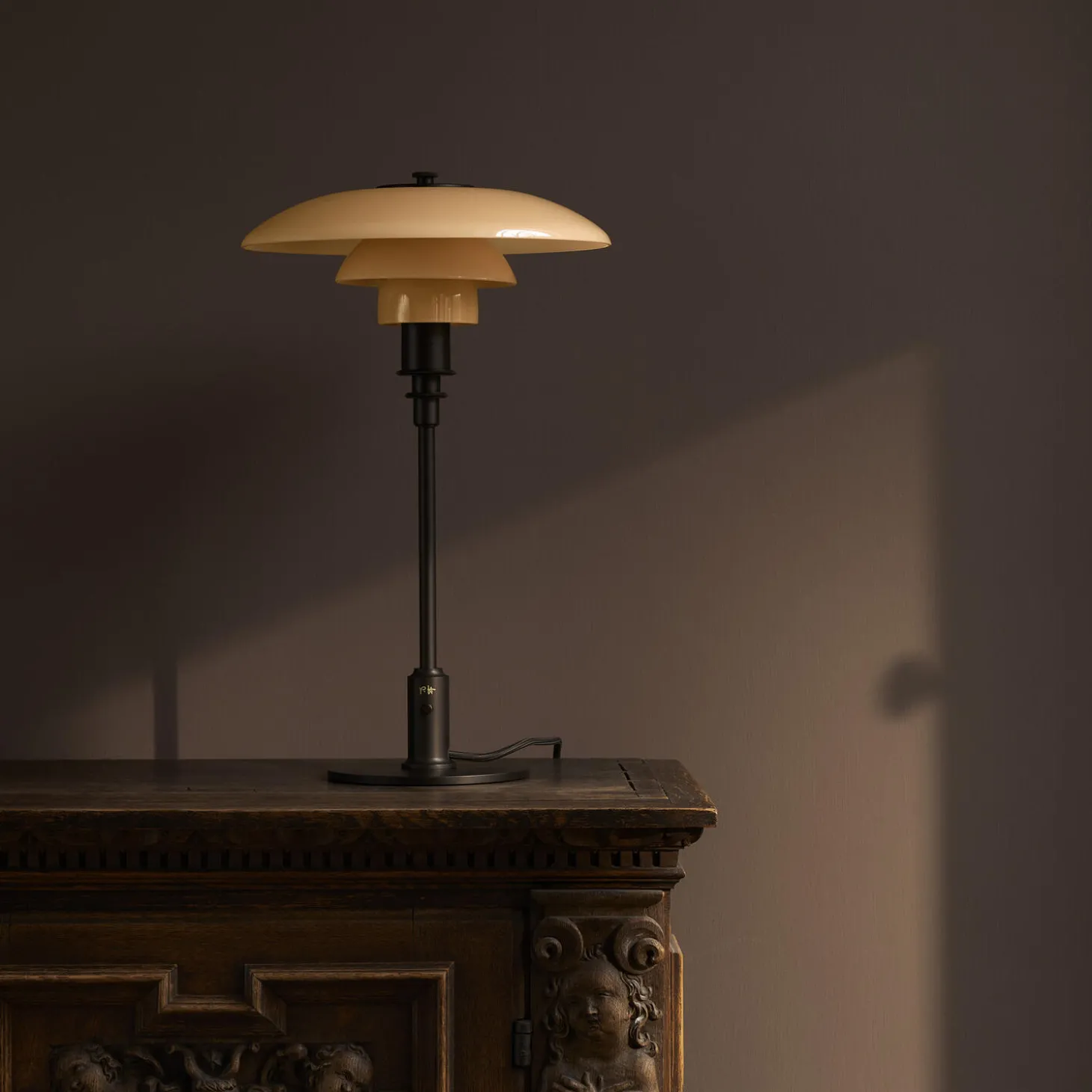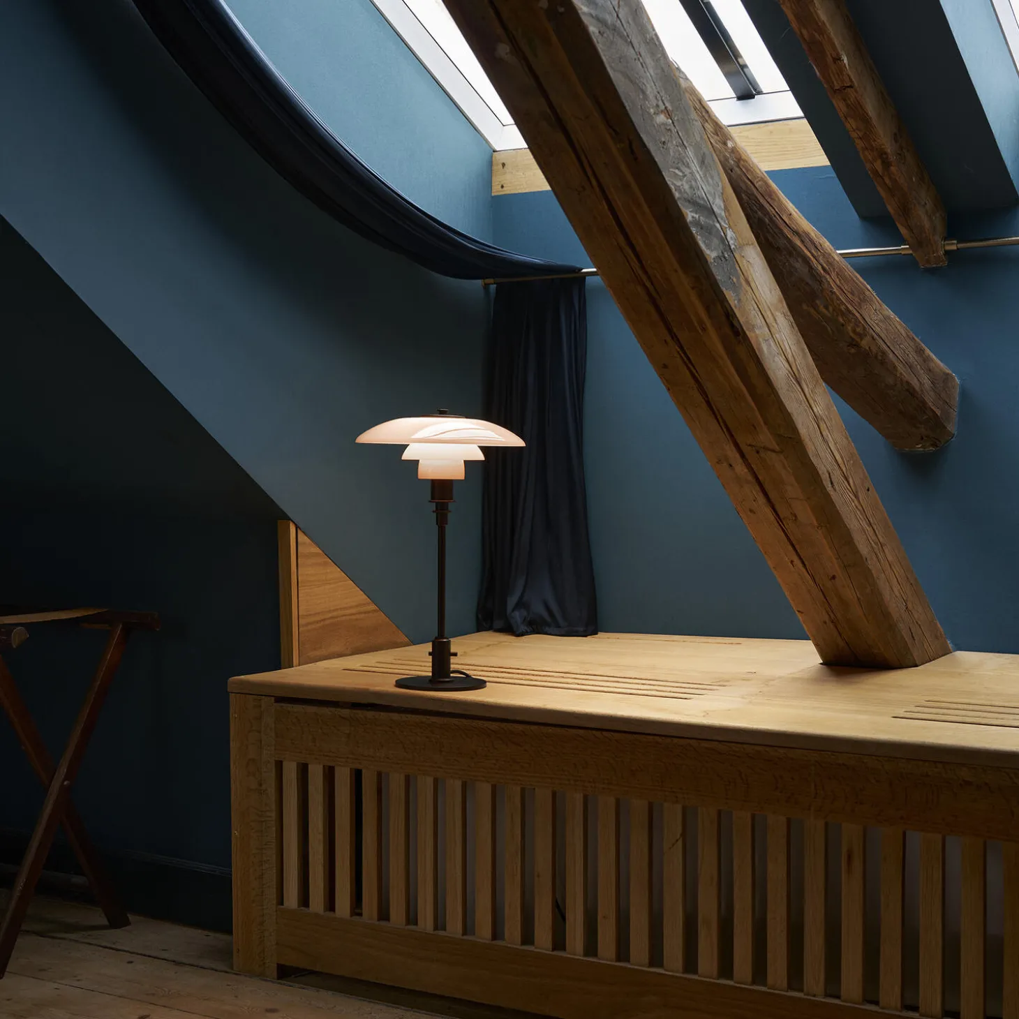 PH 3/2 Dusty Terracotta bordlampen er baseret på Poul Henningsens System PH med tre glasskærme, der giver nedadrettet, blændfri belysning som udsender et behagelig lys. Det mundblæste, støvede terrakottafarvede glas i fire lag er blankt på ydersiden og en sandblæst mat opalhvid på indersiden, der giver et stemningsfuldt og varmt lys.