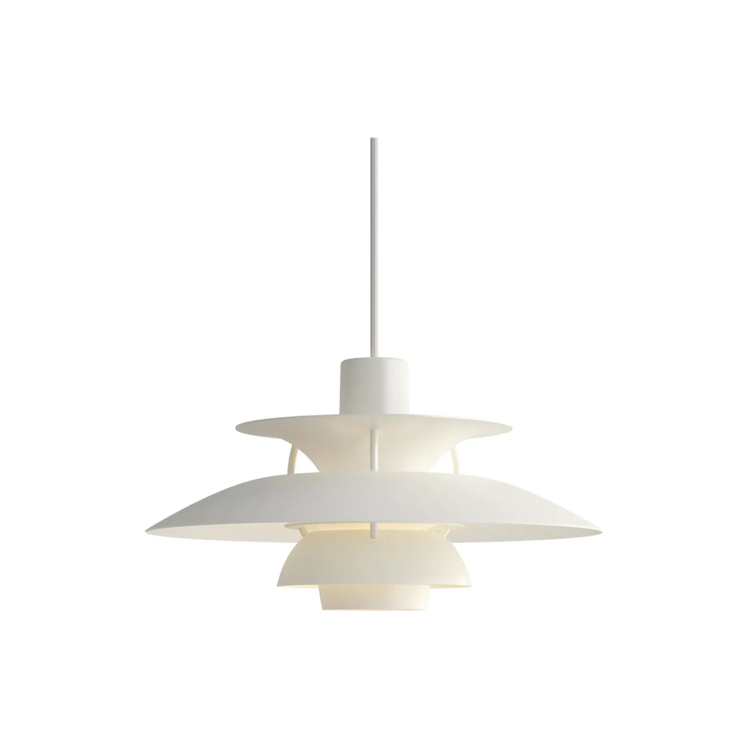 PH 5 Mini Monokrom pendel med skærme og afblændingsskærm i optrukket aluminium og stag i valset aluminium fra Louis Poulsen. Farve: white. Mål: H: 16,3 x Ø 30 cm. Lyskilde: maks. 20W E14. Design: Poul Henningsen.
